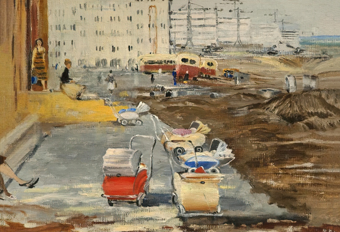 Пименов. Движущаяся граница города. 1961. Холст, масло. Тут абы какая жизнь – это установка на будущее, а пока-де – потерпим с неудобствами. Так когда-то строили, не комплексно – сдавали дома без обустройства территории. Пипл схавает. А хвала – опять открытые цвета там и сям. Можно возразить, что страна бедна из-за гонки вооружений, навязанной ей извне. Но этого нет в “тексте” картины. Пименов не витает в эмпиреях, может, с горя, что он бы был исключением, если б витал. Вот он опустился и тут, внизу, насмехается над мещанским счастьем совков.