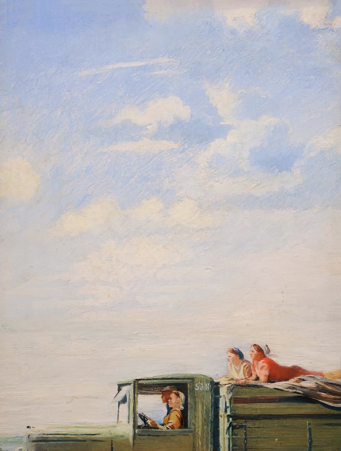 Пименов. Облака. 1949. Дерево, масло. Хвала – синевой неба и счастливыми позами лежащих, а абы какая жизнь – жизнь колхозника с точки зрения художника (он ведь не зря изобразил колхозниц счастливыми – дистанцировался от них). Ибо всё нацелено в 1949 году на восстановление разрушенного войной хозяйства, на материальное, а не на гармоничное. Вообще – надоело. Как самому Пименову не надоедало? Видно же, что левой рукой рисовал. Душа его была где-то далеко. Он был в отчаянии в последней глубине души оттого, что не видно было после войны движения страны к коммунизму. Началось это у него давно, еще от поражения коммунистической революции в Германии 1923 года, из-за чего он пришёл к экспрессионизму, стилю ужасно деформирующему натуру от ужаса, что в какое-то бесконечное сверхбудущее удалилась перспектива наступления коммунизма на планете.