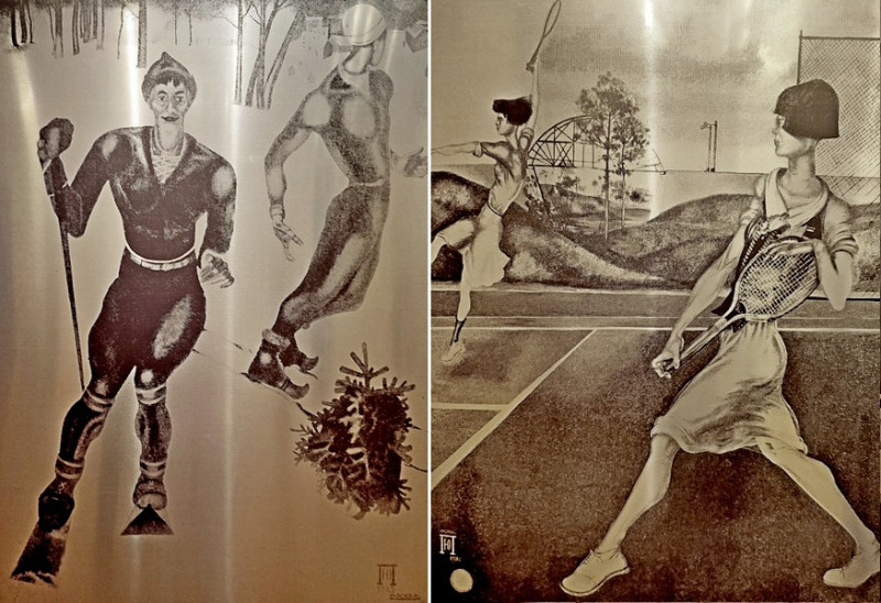 Пименов. Лыжники. 1925. Холст, масло. Теннис. 1926. Холст, масло. В спорте, мол, дорога ухода от гармонически развитого человека, ибо духовное испаряется*. Причём такое умонастроение у него было в подсознании. Ибо в сознании мерещилось что-то самообманно-прогрессивное и экономное в духе бедности страны, идущей к социализму: "…передача реальной убедительности явления при минимальном использовании выразительных средств… моментальное схватывание в вещи ее существенных признаков при опускании деталей… динамичность и острота” (https://sias.ru/upload/iblock/363/sbornik-nauchnaya-vesna_10-razvorotami-_1_.pdf). 21 июля 2023 г. * - А вот некоторые (теоретики искусства 20-х годов) логично считали иначе: “С величайшим вниманием “Вещь” [журнал] за взаимоотношениями между новым искусством и современностью во всех её многоликих проявлениях (наука, политика, техника, быт и пр. [значит и спорт, ибо он тоже новое явление в мире]). Мы видим, что на развитии мастерства последних лет оказали крупное влияние, лежащие вне так называемого “чистого искусства” [нереалистического, натурокорёжащего: нам враждебны непосредственные пережитки вчерашнего промежуточного дня, как то символизм, импрессионизм и пр.]. "Вещь” будет изучать примеры индустрии, новые изобретения, разговорный и газетный язык, СПОРТИВНЫЕ ЖЕСТЫ" (Журнал “Вещь”. https://www.togdazine.ru/article/1263).Например, выпяченный живот правого лыжника, полуприсед левого, движение задом наперёд левой теннисистки… - Так это как раз от ума, а не от естественности. От мнения, что раз наука в лице Маркса открыла, что базис управляет надстройкой, т.е. действует неосознаваемо для субъектов, то после этого открытия жизнь субъектов можно строить, созидать самим субъектам, но не как мещанам, а как общественникам от ЦЕЛЕСООБРАЗНОСТИ. 31.07.2023.