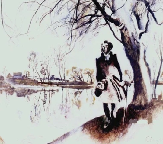 Моисеенко. Пушкин в Михайловском. 1974. Мы читаем стихи Пушкина, и, где есть кони, у нас ассоциация "с вольностью и свободой” (https://proza.ru/2008/10/31/16). Из-за чего? Из-за того, что Пушкин в стихах не по лесу ездит возле Михайловского: