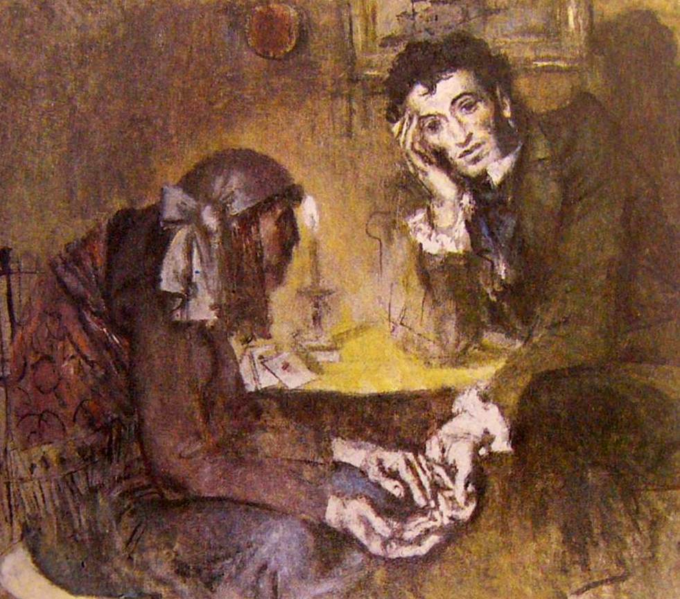 Вы себе не представляете, читатель, какая это сласть, угадать подсознательный идеал художника (а такой идеал рождает произведения неприкладного искусства), и потом брать одно за другим его произведения и по его, художника, манере, тоже угаданной, идеал этот выражать – анализировать и получать подтверждения правоты дважды угаданного. Евсей Моисеенко после войны в последней глубине души был крайне разочарован тем лжесоциализмом (без самоуправления), который построили в СССР, и теми совками, какие дали себя к нему приобщить. То есть настоящий социализм (с отмирающим государством, и наступлением коммунизма, когда государство совсем отомрёт) был у Моисеенко подсознательным идеалом, не данным сознанию. И вдохновение, требуя выразить это бессловесное, заставляло художника отчаянно корёжить натуроподобие, раз так безнадёжно было что-то сейчас и в будущем изменить к лучшему. Сознание же стремилось потакать общепринятому положению вещей. А подсознание заставляло художника людей этого лжесоциализма выставлять совками. Ограниченными людьми. Скажем, советские люди – любят Пушкина, и сознание художника с энтузиазмом это рисует. А подсознание – незаметно для сознания – портит картину. Люди оказываются совками, воспринимающими произведения Пушкина почти “в лоб”. А в своих картинах об этом подсознание Моисеенко ставит им, совкам, подножки, которые те (да и сам художник) не замечают. (И власть тоже, и очень его хвалит.) Например.