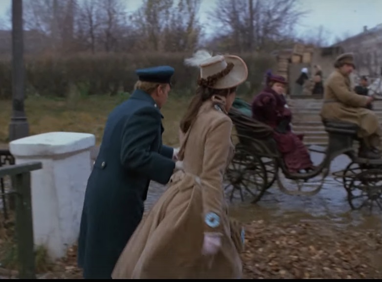 На этом кадре видно, что Паратов край плаща замочил, и тот потемнел даже больше, чем надо из-за предыдущих дублей съёмки. А через несколько секунд, рассчитываясь с жандармом за держание под уздцы коня, плащ уже сухой.