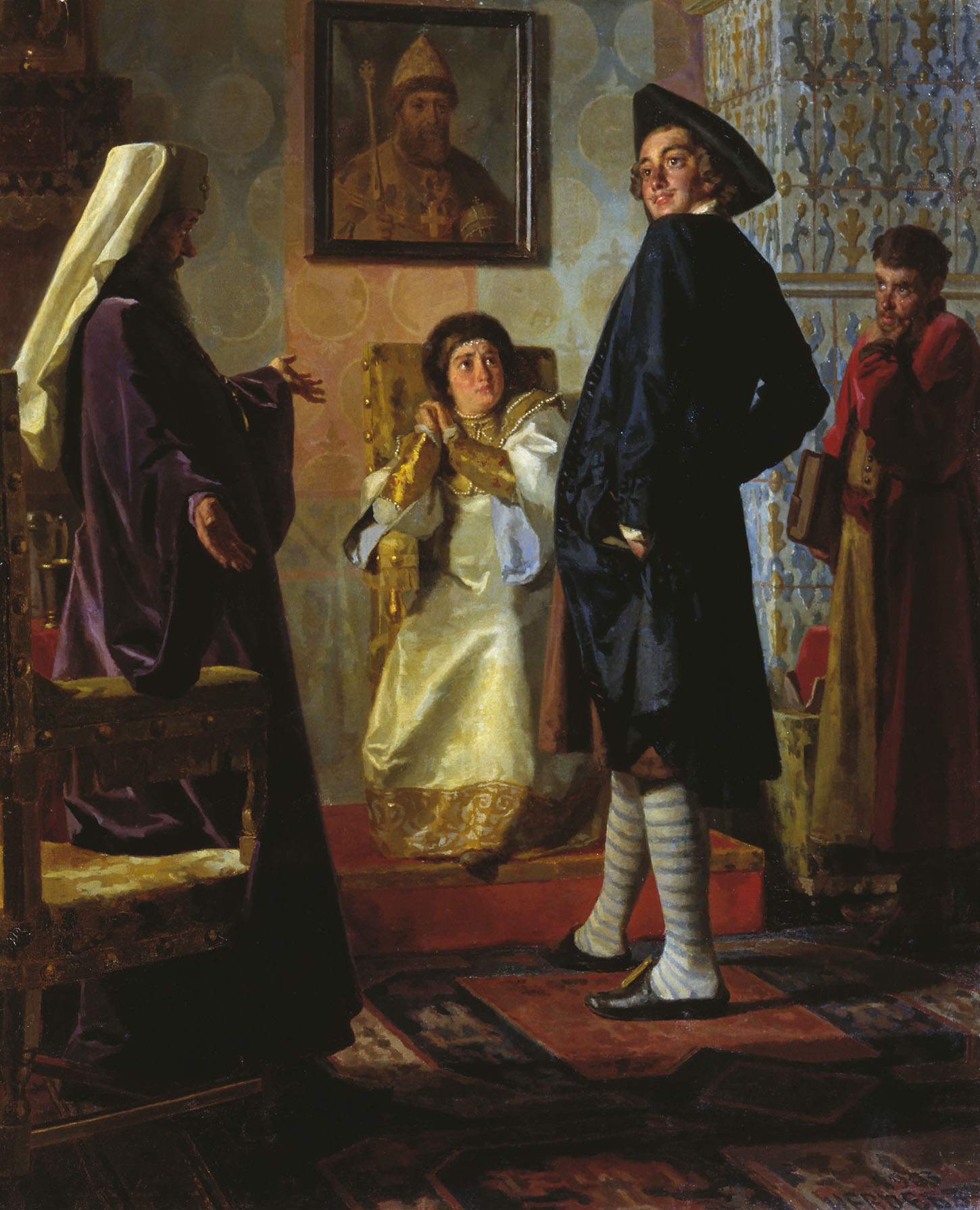 Николай Неврев. Пётр I в иноземном наряде перед матерью своей, царицей Натальей, патриархом Андрианом и учителем Зотовым. 1903. Но хорошо, для фильма сойдёт и Доробченко. Фильм таки создал впечатление, что Лиза высококультурный человек. Согласимся. Ну? Так как она могла творить такую халтуру в области культуры, как пытаться устроить ну очень некультурную Вику в телевидение, в музей?.. Причём это не подпадание Смирновой под власть фабулы. (Она участвовала в создании сценария.) Или такой нюанс: ⌠- Давай, бери ручку. Так-так-так, значит. Индия, Китай, Египет┘ Э-э-э. Я тебе потом всё объясню, потому что надо будет, но немного. Европа. Значит, Ев-ро-па. Давай, пиши. М-м-м. Античность. Средние века. Эпоха Возрождения. Маньери┘ не пиши. Это тебе не надо. Сразу: барокко. Рококо. - Кококо? - Ро-ко-ко. Классицизм и романтизм, модерн, ардеко. √ Всё!■. ⌠Ар-деко - влиятельное течение в изобразительном и декоративном искусстве первой половины XX века, которое впервые появилось во Франции в 1920-х годах, а затем стало популярно в 1930≈1940-е годы в международном масштабе, проявившееся в основном в архитектуре, моде, живописи, и переставшее быть актуальным в период после Второй мировой войны. Это эклектичный стиль, представляющий собой синтез модерна и неоклассицизма. Стиль ар-деко также имеет значительное влияние таких художественных направлений, как кубизм, конструктивизм и футуризм■ (Википедия). Ни я разобрал звучания этого ⌠ардеко■, ни я знал о его существовании. Но я очень неравнодушен к маньеризму, и он существовал целый век, и без него нельзя ⌠понять■ следующее за ним барокко. Я в долю секунды возмутился. Это тот стиль, наряду с барокко, на котором лично мне было показано двумя авторами в одном давнем искусствоведческом альманахе, что большие стили искусства повторяются в веках, движимые изменением идеостиля. Изменение которого, как оказалось, тоже закономерно: идёт по кругу. Это мало кто знает. Но я убедился, что это так. И всю жизнь иллюстрации этого явления посвятил. И я не понимаю, как можно глубоко понимать искусство, не понимая, из-за чего идеостили сменяют один другой. Но Смирнова, чего доброго, тоже не зная этого всего, всё же этим своим: ⌠Маньери┘ не пиши. Это тебе не надо■, - отлично лично мне продемонстрировала поверхностность подхода Лизы к обучению Вики. И понять можно, что сама-то Смирнова против такой поверхностности. И против самой идеи равенства и справедливости. √ Из хама нэ зробыш пана┘ Телевидение, куда пытается всунуть Лиза Вику, √ это для масс. Это √ низменное. Там √ годится эта вульгарная Вика. Ну так мир-де устроен естественным образом: кто-то √ внизу, кто-то наверху. И нечего, мол, это переустраивать, как уже пробовали при советской власти, да лопнула она. Равенство √ не-ес-тественно. Мол. Лишь поняв этот посыл, я как бы вынул занозу. Я отвергаю такую идею. Но фильм хороший. Заставляет думать. Мастеровитый: по пути большого сопротивления ведёт (автор отвергает ту, - Лизу, - которую с изрядной любовью показывает, и за массу плюсов принимает √ в своём качестве, необходимом для верхов, √ низменную Вику). Я поступил неадекватно, выполняя ⌠заказ■: дал субъективный взгляд на фильм, а от меня ж хотели объективного. Я не дал слова так называемому адвокату дьявола. Ну, например. Опустила ж Лиза не только стиль маньеризма, но и стиль реализма. А поскольку фильм
