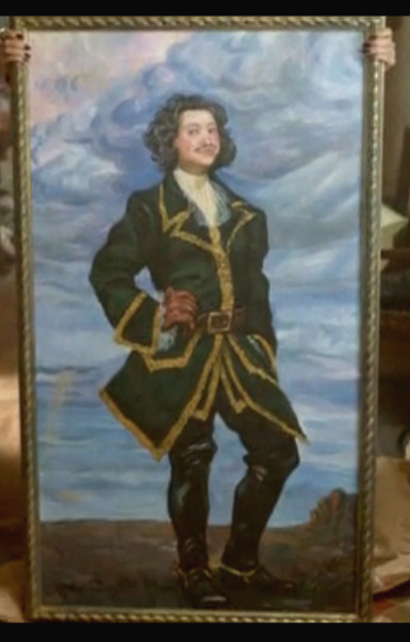 Подарила Вика Лизе взамен испорченного Тышлера. В галерее на Невском взяла. Очень хороший художник. Доробченко. √ Лиза такого не знает. √ Подозреваешь (коль скоро эта Вика всё время вляпывается во что-то), что и тут она вляпалась. Но √ только подозреваешь. Ибо 13 секунд этот "Пётр Первый" присутствует в кадре, и разобраться не успеваешь. Нет потом, скопировав, всмотревшись, увидев, что ноги непропорционально коротки, что Пётр разодет, а главное, что он √ позирует, игриво засматривая на художника, подозрения усиливаются. Петра в действии все изображали. Даже если он и демонстрировал себя, то делал это активно, с вызовом, например.