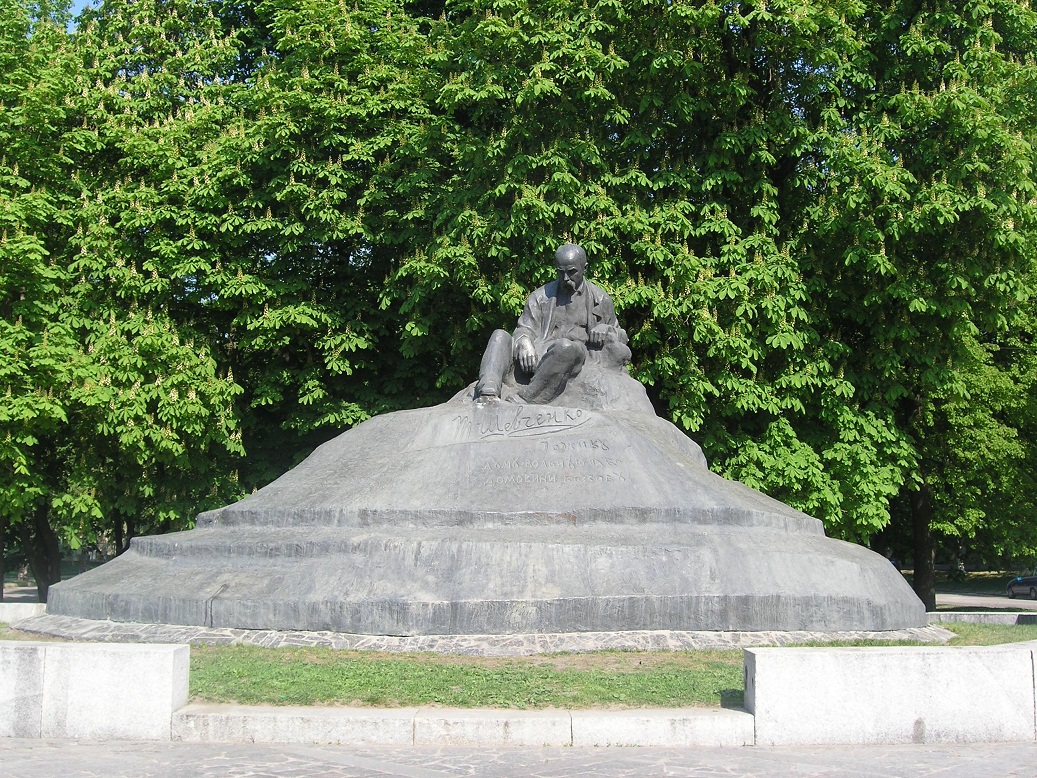 Недавно я за Уралом / Блуждал и Господа умолял, / Чтобы наша правда не пропала, / Чтобы наше слово не умирало; / И вымолил. Господь послал / Тебя нам, кроткого пророка / И обличителя жестоких / Людей несытых. Свет мой! / Моя ты зоренько святая! / Моя ты сила молодая! / Свети мне, и согрей, / И оживи мое побитое / Убогое сердце, неукрытое, / Голодное. И оживу, / И думу вольную на волю / Из гроба воззову. / И думу вольную... О доля! / Пророк наш! Моя ты дочь! Твоею думу назову. Это написано за два года до отмены крепостного права. То есть в политический кризис. ⌠Введенный императором Николаем I "цензурный террор" после его смерти в феврале 1855 г. был фактически сметен волной гласности, позволившей открыто обсуждать самые острые проблемы, стоящие перед страной. В связи с коронацией Александра II в августе 1856 г. были амнистированы участники Польского восстания 1830-1831 гг., декабристы и петрашевцы. В правительственных кругах не было единства по вопросу о дальнейшей судьбе России■ ( http://www.gumer.info/bibliotek_Buks/History/Dvor/10.php).Марко Вовчок √ это женщина, которую Шевченко называл своей дочкой. Она-то писала антикрепостнические рассказы, но пристрастилась к украинскости. И последнее, видно, воодушевило Шевченко, увидевшего в ней свою наследницу. Что волнует Шевченко? Кто такие жестокие несытые люди? Крестьяне, угнетённые помещиками и готовые вот-вот восстать? Или помещики, жестоко угнетающие крестьян даже при риске восстания? Или и те, и другие, которых обличает Марко Вовчок за жестокость? Нет. Шевченко заботит совсем другое: исчезновение украинского языка и украинской правды. Что это за украинская правда? √ Мечта о независимости, конечно. Плевать ему на экономический строй. Важна украинская государственность. Он чувствует, что крепостничество вот-вот рухнет. Россия обновится. Но это ж не коснётся судьбы украинскости. В этом состоит его тяжёлая дума. Кавалеридзе это чутко уловил и изобразил Шевченко понурым. Потому что то же светило Украине и при большевиках. Те были интернационалисты, жить мечтали без Россий и Латвий в масштабе планеты. И их популярность в народе, в том числе и в украинском, ничего хорошего для украинскости не сулила. Такому народу было не дотянуться до дум Шевченко. Что Кавалеридзе и выразил. √ Как? √ Он сделал памятник очень демократичным: не ограждённым и на постаменте, по которому можно, казалось бы, взобраться.