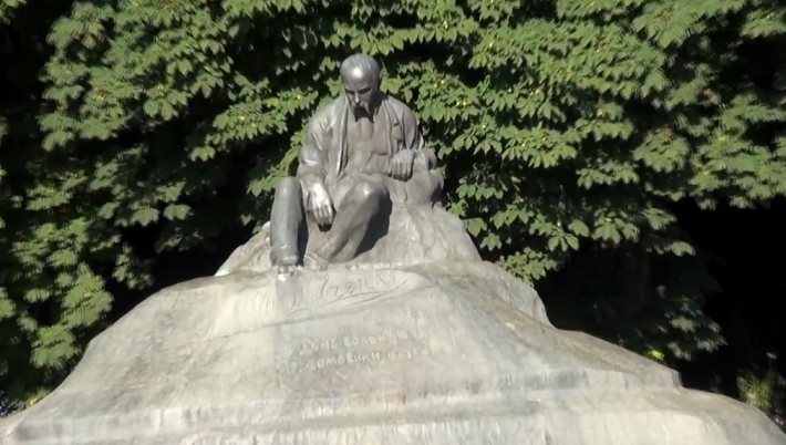 Потому что задумчивый Шевченко. Яснее √ в надписи на памятнике шевченковских слов 1859 года: