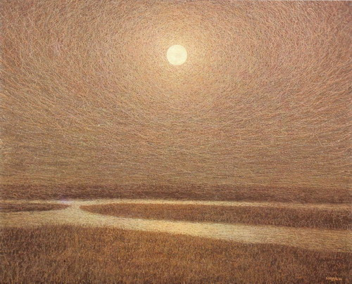 Я самовольно перестал списывать названия, которые он стал вдруг давать своим произведениям. Он портит их. Здешностью. Тутосторонностью. Типа ⌠Тече рЁчка Снов. 1984■. Но это и хорошо, если художник сам себя не понимает. Почему возник стиль модерн на грани XIX-XX веков? √ От скуки мирного развития. Бедные беднели, богатые богатели, и все √ одинаково пошлые и низменные. И не видно было выхода из этой скуки. Марчук собственно то же видел в своей жизни. Он даже ужасы катастройки и реставрации капитализма начала 90-х не застал √ ⌠Протягом 1989√2001 рокЁв мешкав у АвстралЁ©, КанадЁ й США■ (Википедия). А там √ от сытости заскучать можно. Вот и доводил себя до предвзрывного состояния специальной техникой исполнения картин: ⌠...ничто не отвлекает его от работы, которую Марчук называет утомительной, скучной и неинтересной для столь подвижного человека, как он. Сколько километров тончайших нитей пришлось ему провести на холсте и бумаге, чтобы сплести две тысячи картин!■ (http://www.gordon.com.ua/tv/marchuk). Предвзрыв от скуки и порождает ницшеанство, а то √ странные картины. Можно даже удивляться, насколько чутки были к идейным врагам советские деятели от искусства, отказавшиеся считать его художником. 30 октября 2014 г.