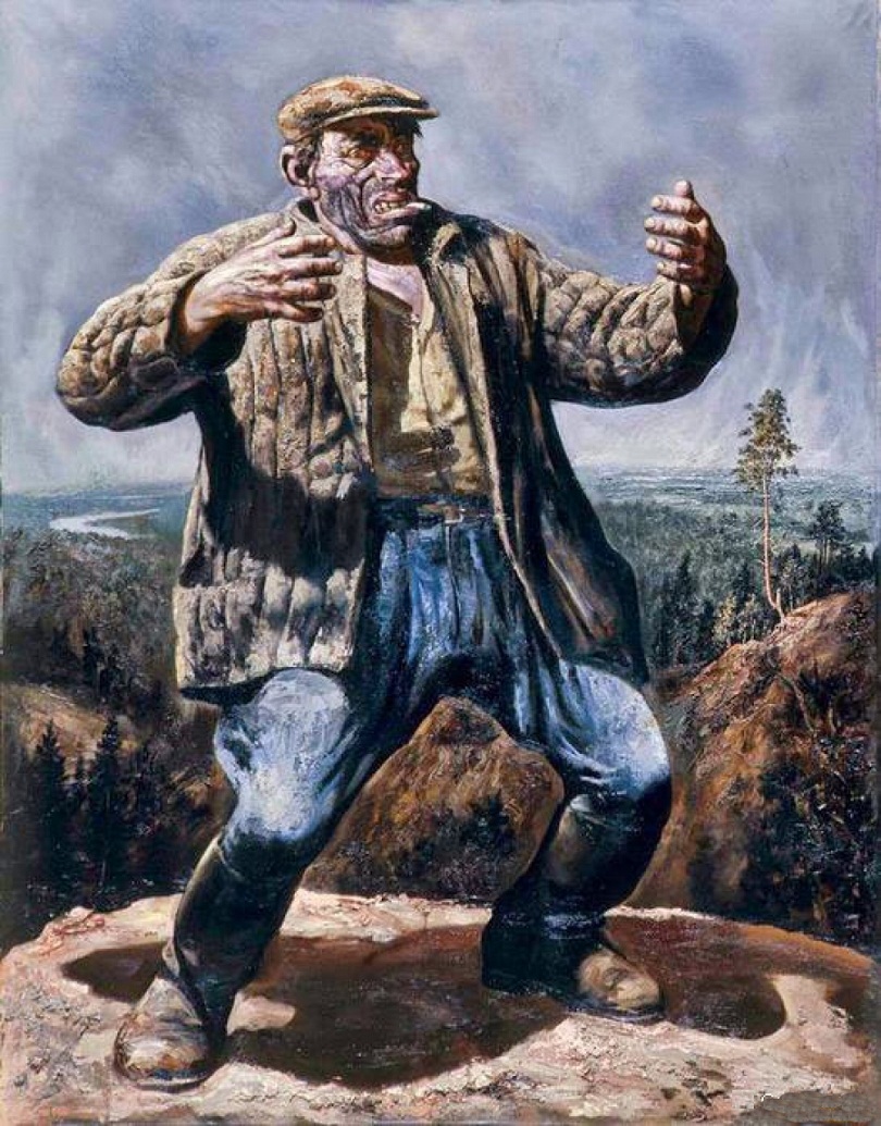 Шульженко. Направляющий. Активность изображённого Шульженко выдаёт. Он √ активный в своей художнической деятельности √ себя считает выше того активного. Ибо, если уж ты активен, то будь достижителен, а не┘ в ватнике. Я, извиняюсь, на этой картине Шульженко считаю образно изображённым лично себя. Мне отвратительны магазины. Я лет 30-40 не покупал себе верхнюю одежду. Даже в носках, давно штопанных-перештопанных, я хожу в купленных пачкой в 5 штук 10 лет назад. √ Ну ватник, как говорится. И при том занимаюсь просветительством. Направляющим пытаюсь быть в духовной жизни. Как этот кургузый мужик: пятится (и я √ за традиционализм и против прогресса материального) и приглашает (в коммуну, если и не паровоз, то желающих), не замечая, что в обрыв направляет (я от него отличаюсь тем, что про обрыв знаю и предлагал √ даже первым лицам государства √ кампанию УКОР-модернизации, ПОКА-модернизации объявить в стране, чтоб страну не ликвидировали соседи за неспособность к конкуренции). Веет в воздухе российском ориентация на традиционализм (в пику американскому глобализму, молящемуся на неограниченный прогресс, из-за которого человечество погибнет от перепроизводства и перепотребления). Вот Шульженко это веяние и отобразил с ненавистью. Вот потому буквально вчера я натыкаюсь на такое зазывное название в своём почтовом электронном ящике: ⌠Владимир Путин назвал любовь смыслом жизни■. Так оказывается √ любовь к отчеству. √ То, что образно выражено на заднем плане на картине Шульженко. Как в воду глядел Шульженко: будете коллективистами, ватники, не будете индивидуалистами, не будете ценить выше всего Личную Пользу √ пропа`сть вам впро`пасти! Что именно за индивидуализм он, можно уж точно судить по такой его картине.