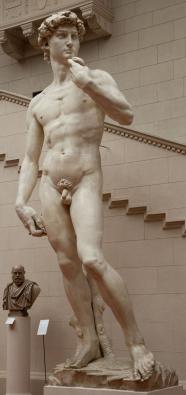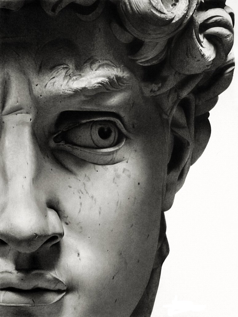 Это фото фрагмента лица статуи Микеланджело “Давид” (1504). И вы посмотрите, какая буря у Давида на переносице. Да и в глазу. Да и в брови. Точнее, след бури. Только что он убил Голиафа, намного, казалось, более сильного, чем он. Я потом объясню, что за логика и что за требование. А пока мне хочется, красно говоря, передохнуть. Повспоминать. Пятиметровая копия микеланджеловской статуи есть в музее имени Пушкина в Москве. И я её видел, когда там был не раз. И не произвела она на меня впечатления.