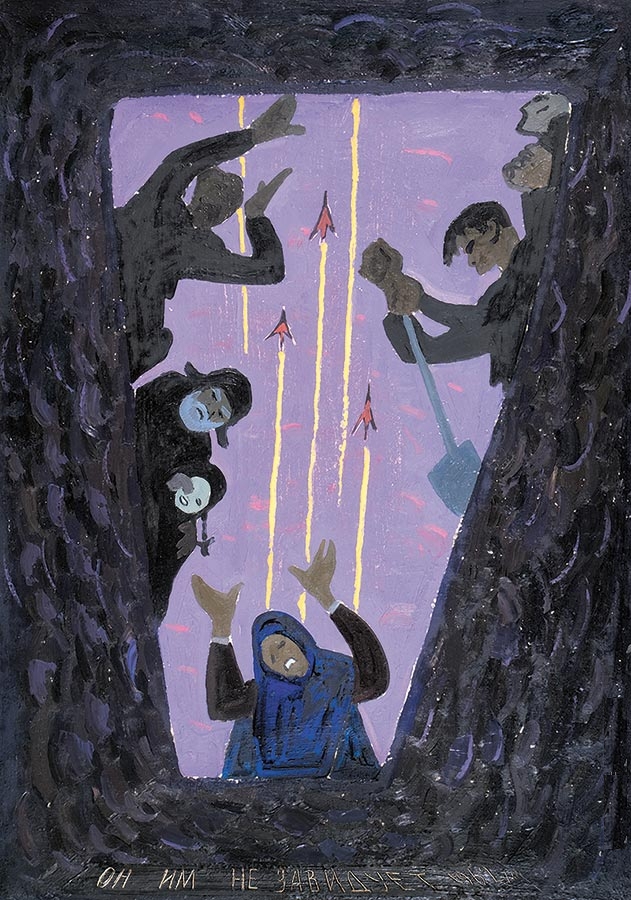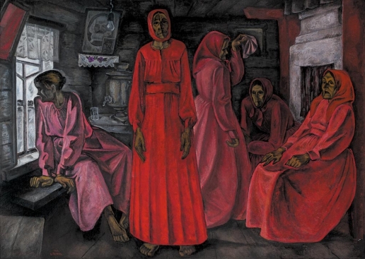 "…намеренно отринута соразмерность фигур и пространства (огромные старухи упираются головами в потолок избы, что создаёт впечатление стеснённости жизни), а также натуры и её трансформации – это особенно заметно в чрезмерной “костистости” фигур и гранёной конструкции лиц. Искажены в этой картине и цветовые характеристики” (Там же). И Карл Маркс в красном углу, где бывали иконы до советской власти. То есть сами повесили. То есть до жизни такой плохой довела самими же и признанная советская власть. Вдовы и воспоминания тут – в связи с коллективизацией, добровольно-принудительно (но больше добровольно) и проведённой. То есть, виноват именно Карл Маркс. Только сознанию персонажей это не дано. Это дано автору картины. Да и то дано не давно, а недавно, раз он так остро реагирует на открытие (к тому же в 1966 году неведомое ещё почти никому). "Произведения Попкова полны предчувствия беды, уже состоявшейся или фатально предопределённой” (Там же). Беда краха идеи коммунизма. Эти бабы не зря все в красном. Чего Попков не осознавал, наверно, что тут и беда краха прудоновской идеи анархии (без центральной власти), идеи самоуправления и федерации федераций, с которой всё поначалу-то началось в 1917-1918 годах. И не могло не быть задавлено при акценте не на прудоновскую мирность эволюционность, а на марксовую революционность. Была бы мирность – виделся б коммунизм в историческом будущем. А так… - Разве что – в сверхисторическом будущем. А это – пессимизм. Впереди же – возвращение в ночь капитализма. Горе не только позади, но и впереди. Хоть это и противоречит названию картины. "…его образы гораздо глубже. Они несут на себе тяжесть разорения деревни и, возможно, не только вследствие войны… Сокрушена старая культура, опустошены души людей, коротающих свой век в тоскливом одиночестве опустевших деревень” (Там же). Только теперь, через полвека, всё виднее становится, что в противостоянии прогрессизма и традиционализма спасение человечества от глобальной экологической катастрофы из-за перепроизводства – в традиционализме, в принципе “каждому – по разумным потребностям”, то есть в коммунизме, которого – наоборот – закат предвиделся (и верно) Попковым ещё в 60-х годах. При таком предвидении понятно, что и великие сибирские стройки (плавно сменившие сталинское название великих строек коммунизма) вели не к благу, раз по пути к нему наплевали на личность, на самоуправление и дали комсомольцам-добровольцам только исполнительскую часть творческого, по идее, труда по строительству коммунизма.