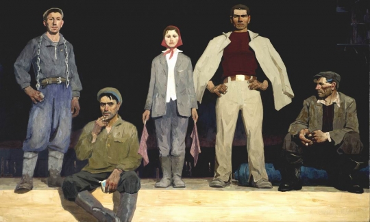 Попков. Строители Братска. 1960. Им сказали: вы поживите во имя будущих поколений. Они по инерции революции ещё 17-го года, докатившейся на полвека до них, согласились, смутно ощущая, что что-то не так. Им не догадаться, что давнее обещание, что каждая кухарка будет управлять… нарушено, и их в глубине души оскорбляет. Но художник, может, тоже не ахти как это просекая, - всё же больше понимает, раз даёт такую черноту фона. Оно-то, да, это изображена ночная смена, что под прожекторами работает. Но… И это не картина антикоммуниста, не картина перебежчика в идеологию либерализма, как сделал Окуджава и многие другие бывшие левые шестидесятники - от безнадёжности социализм вылечить. Так мрачно на обманутых строителей коммунизма может смотреть только истинный прокоммунист.