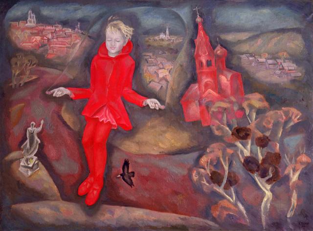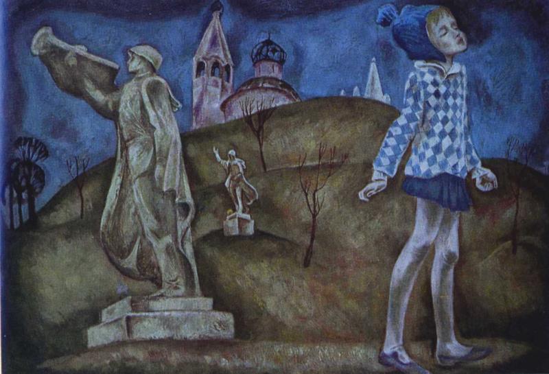 может, просто рамой обрезан крест. В самой правой из-за дали, может, креста не видно (в “Майском празднике” на дальних церквах точно из-за дали крестов не видно). А в центральной он, вроде, даже и брезжит в сумерках. И полуразрушенности цементных памятников вашему глазу не видно. Да и не бывает цементных. Просто искусствовед для словесного нагнетания это слово притянул. “Бетонный” же имеет другую ассоциацию: мощь, а не пыль. А "голая земля” и "засохшие деревца” могут быть и ранневесенними, если всего лишь прошлой весной закончилась война, так что успели поставить бетонные памятники. На самом деле – девочкам мерещатся розовые и голубые сны наяву. Не зря в обеих картинах персонажи – дети. Те, кому важны, - да, для какого-то приятия жутковатого мира, - волшебные сказки. Но что-то подобное, оказывается, нужно в 1972 году и иным взрослым на некотором этапе их творческого развития в этом страшном мире краха прежних идеалов. Для Попкова – идеалов коммунизма. Пусть этот крах и не окончательный, имея в виду какое-то чуть не мистическое сверхбудущее. Спустя полвека это сверхбудущее лишается своей мистичности из-за угрозы смерти человечеству со стороны материального прогресса (т.е. капитализма). То есть реально стало человечеству договориться (об отказе от неограниченного прогресса и капитализма). Но полвека до того мир для провидца Попкова был достаточно "трагичен” (Там же). 9 мая 2016 г.