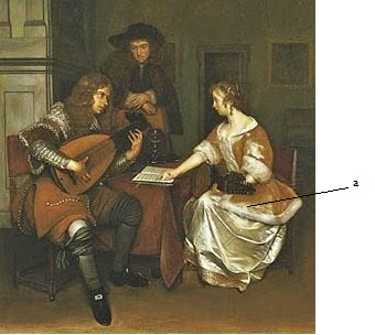 Речь, наверно, о месте "а". Потому что сверкание кофты на правом (глядя от нас) рукаве тоже не мягкое. Далее. "…восхитителен и общий тон; глубина тонущей в сумраке комнаты". Почему сумрак комнаты восхитителен? Может, из-за слова "тонущей"? Тонут постепенно. Так, может, Бенуа видит в комнате градацию многих тонов сумрака? – Их, действительно, аж пять: 1) открытая в комнату дверь слева, 2) правее от неё тень от неё на стене, 3) тон стены вне этой тени, 4) тон картин, висящих на той стене и тон мебели, стоящей у той стены, 5) тон рам тех картин. Это – градация, можно сказать, резкая. Есть и плавная – на полу. – Но неужели это называть восхитительным? Может, всё же пренебречь словами Бенуа "абсолютно" и "величайших мастеров всей истории искусства" (занесло-де его) и подумать, что он на другой строчке своей же статьи сравнивает Терборха с современными ему французами? Кого он там упомянул? – Братьев Ленен.