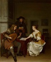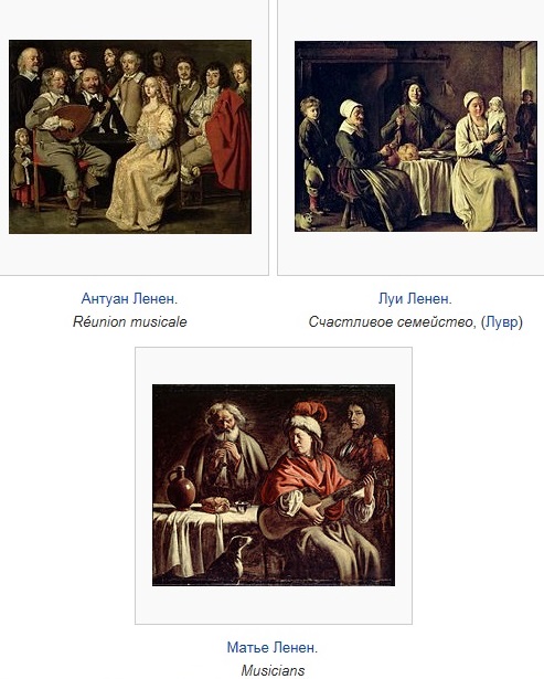 В самом деле градаций сумрака меньше. Но… Неужели можно всех обскакать на рисовании сумрака? – Вероятнее, что просто в ту секунду писания Бенуа захотелось о сумраке написать хорошо – он и написал. И потом – там есть же ещё и "общий тон". Он – если мыслимо его назвать словами – коричнево-зелёно-серый. Уход от него в чёрное (в сапоге) и в белое (в блеске платья) как-то в самом деле сродно этому коричнево-зелёно-серому. Но. Ленены, если и пестрее (красные накидка, верх шляпы, пальто и ноги крайних слева детей), то настолько немного, что я не знаю, можно ли так Терборха превозносить. Или всё-таки можно? У братьев как-то жёстко написано. А у Терборха как бы воздушной дымкой всё окутано. У братьев лица одинаково освещены, а у Терборха – по-разному. Или я позволяю Бенуа себя убедить? Или есть и объективное? Свет-то, и правда, у Терборха всегда "впереди — в противоположность Мирису, Гооху, Вермееру и другим, любившим изображать окна, из которых льется свет". Все трое голландцы. И у них, надо ждать, воздушной перспективы в комнате не будет? – Смотрим.