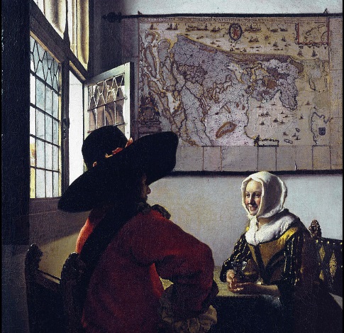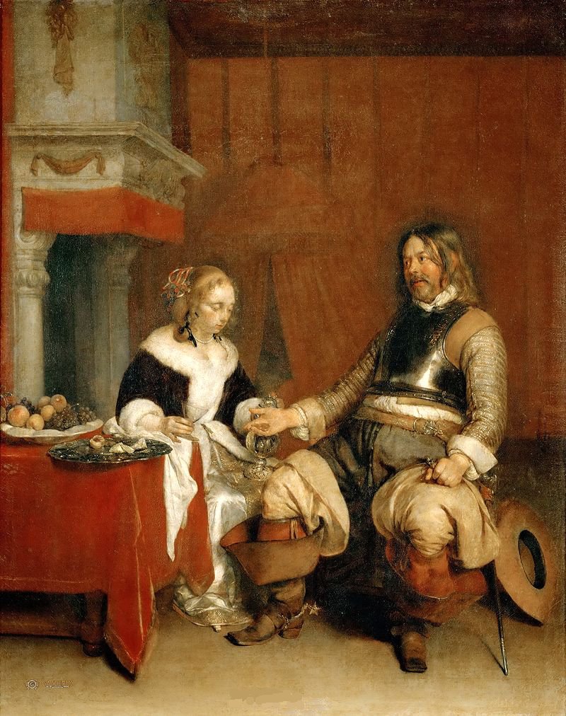 Вермеер. Офицер и смеющаяся девушка. 1657—1659.Ну верно. Или всё-таки я себе внушаю? Но – далее. "Наконец, верх совершенства техники представляет из себя белая атласная юбка… встречающаяся на многих картинах Терборха и доставившая ему наибольшую популярность". Ага! Я ж говорил! Или Бенуа тут смеётся над простецкими людьми, раз "популярность"? Вот и всё. Маловато. Притом я знаю Бенуа, читывал его. Он входит в раж, пока пишет о каком-то художнике, который ему нравится. И не выдерживает общей меры для "всей истории искусства". Поэтому имеет смысл почитать о Терборхе у кого-то другого. Ибо, когда я смотрю на Терборха, моя душа не вспыхивает. Это ж имеет свою причину? Что пишет Эжен Фромантен? (А пишет он о картине "Лихой офицер")