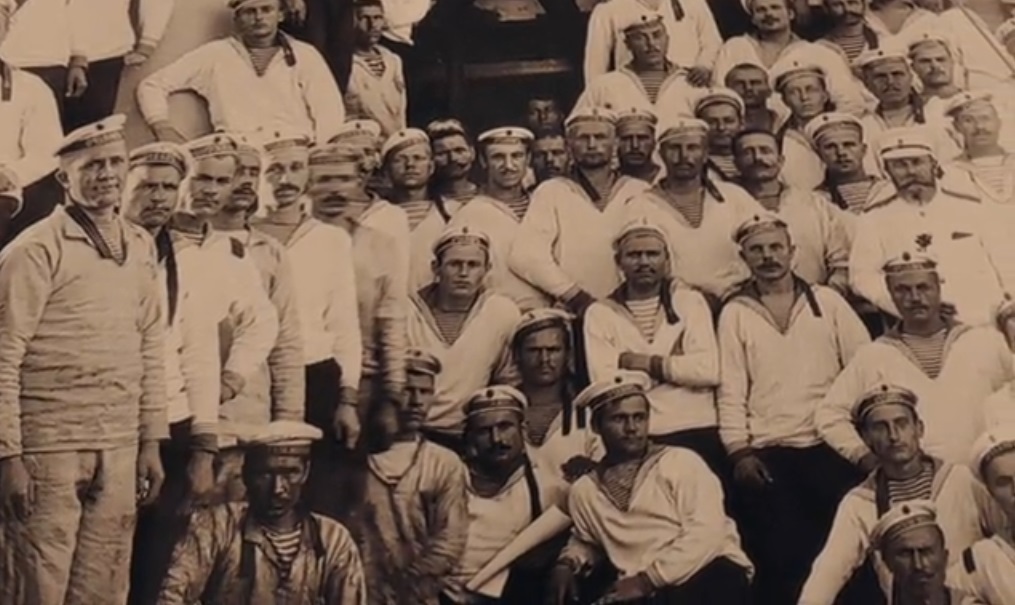 И сам себе разочарованно отвечает: "А-а. Народ есть”. Картина в самом деле неприглядная. Выбрана фотография с такими лицами, что ой. Причём, это явно Россия. То есть я правильно понял, что он Россию видит виновницей всех бед. Агрессивность её, в частности, виновна. Ибо следующая фотография – военных матросов.