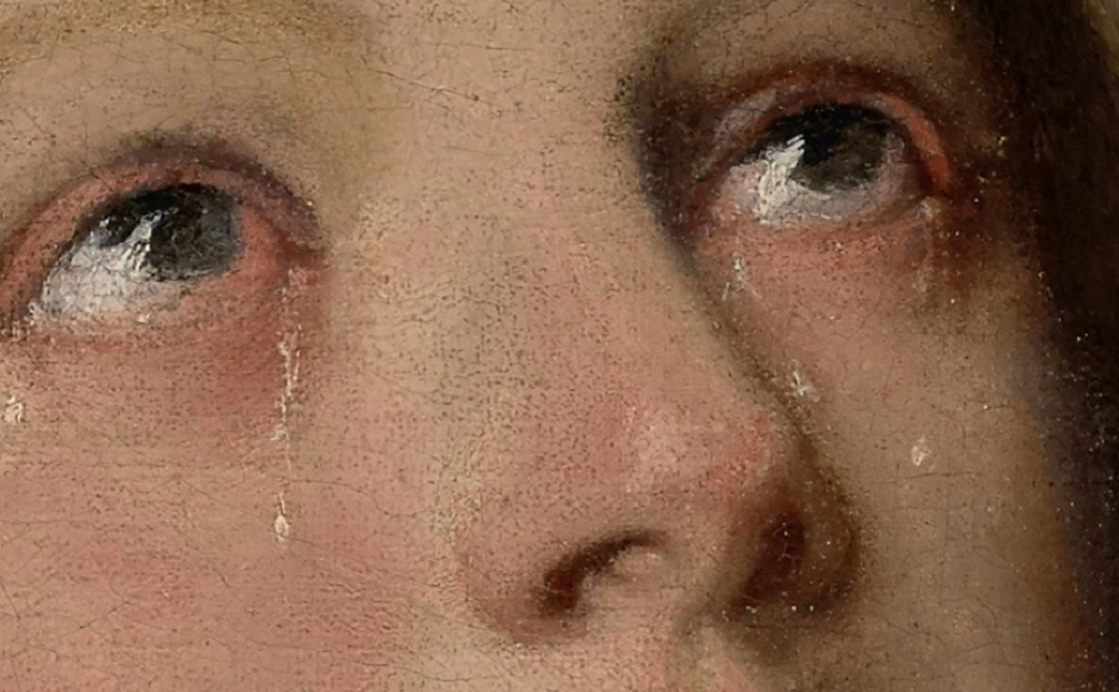 "Это настоящие красочные симфонии” (http://www.artprojekt.ru/gallery/titian/051.html). Смотрите, на коже лица есть и бурый цвет, и зеленоватый, и оба они нескольких оттенков. Один бурый на одной щеке, другой – на другой. Один бурый – в глубокой тени, другой – в полутени. А какой в уголках губ? И разный же в каждом уголке. То же с зеленоватым. Один – слева (от нас глядя) от левого глаза и на левой стороне носа, другой – справа от верхней губы. А сколько оттенков в белках глаз? –В одном левом (от нас глядя) – семь. Что-то то же с губами. Интересно, будет ли то же разнообразие на другой репродукции?