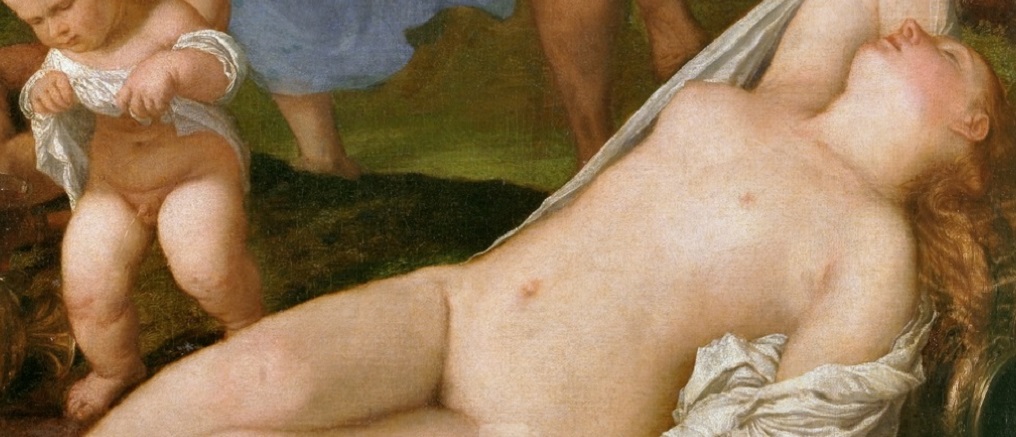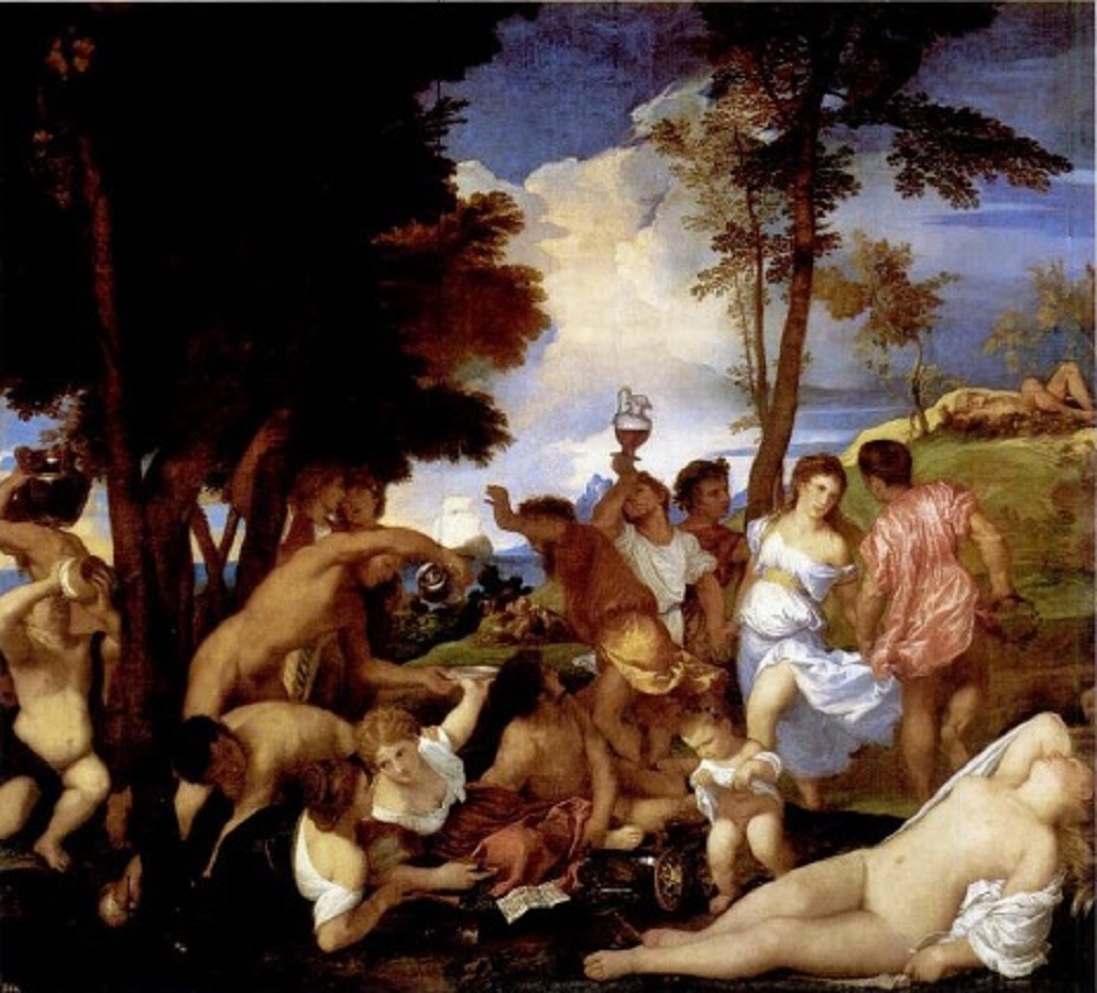 Тициан. Вакханалия на острове Андрос. 1523. Фрагмент. Тут серо-синего, дымчатого, коричневого, чуть не чёрного на коже не найдёте.
