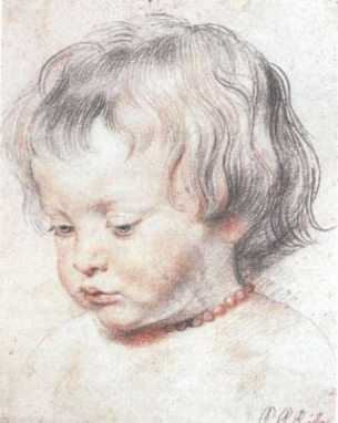 Рубенс. Портрет сына Николаса. Около 1620. Бумага, итальянский карандаш, сангина. Для меня это не обоснование Искусства (которого для Гомбриха не существует): "…он [Рубенс] наверняка гордился его [сына] миловидностью". Для меня это – нехарактерное произведение Рубенса, представителя барокко как соединения несоединимого. Во всяком случае, до тех пор, пока я не дойду до объяснения более глубокого. Объяснения этому отсутствию контраста, которое неизбежно в барокко. И только я это написал, как мне стало ясно, что контраст есть и тут. Надо только вспомнить эпоху, когда портрет рисовался. Это было время религиозных войн по всей Западной Европе. Мол, нравственных протестантов против безнравственных, мол, католиков. А безнравственны все. И нравственны все. И ужасно (для протестантов) – торговать индульгенциями (как католическая церковь) и извлекать выгоду из грешности людей, а честнее представляется вовсе не иметь такой практики, для чего вообще на срок и по очереди избирать себе духовника из прихожан, и верить в Бога по сути, а не по форме. И кажется более честным (для католиков) не думать о грехе, а просто свято верить, что Бог простит, если покаешься, и – богохульство – избирать себе духовника, как протестанты. – Это – про нравственное, высокое, духовно-божественное. Под ним же скрыто низкое, материальное. Святоши задавили испанской военной силой Бельгию, чтоб её предприниматели не смели возмущаться большими налогами. И что такое предпринимательство? – Материальное. – А большие налоги? – Духовное, ибо стимулирует помнить, что главное – не в этой жизни, а в той, загробной, что тоже правда. Так что если духовному соответствует стиль наброска (это истаивающее тельце, эта бледность рисунка, почти его бесцветность)… И что если материальному соответствует эта упитанность натуры, круглые щёчки мальчика, густые волосики… Тогда контрастность есть и тут! И что выбрать? – Неизвестно. И то, и то – верно. И то, и то – ценимо. И – не разорваться. А, тем не менее, счастлив почему-то… в самом этом соединении несоединимого. А жизнь всегда – противоречива. И… всегда найдутся люди, которые, глядя на эту исчезающую на листе бумаги пухлость дитяти, взволнуются аналогией со своими обстоятельствами. И… так и получится бессмертная жизнь произведения Искусства. Может, это словоблудие у меня: противоречивость, мол, есть всегда (уже хотя бы в изображении объёма на плоскости), - и можно всегда, мол, подвести противоречивость под барокко как соединение несоединимого? – Не знаю… Но удовольствие от таких микрооткрытий – определённо есть. С этим наброском, например, я и не чаял, что смогу сам вывернуться. Вон, подстелил соломки на всякий случай, дескать, нехарактерное это произведение Рубенса… Но. Дал задание своему подсознанию: проверить, нет ли контрастности пусть и в наброске. И – получил в сознание ответ через минуту-другую… А ну, попробуем ту же операцию с этюдом другого ребёнка Рубенса, где и речи не может быть об истаивании.