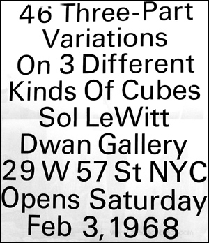 Сол Левит. 46 вариаций с тремя частями на 3 разных типах кубиков. 1968. Бумага 25.9 x 44.4 см, офсетная чёрно-белая печать. Читайте, мол, воображайте и думайте. "Один из концептуалистов просто прислал на выставку телеграмму, где сообщил, что помнит о ней, эта телеграмма была показана в экспозиции. Дж. Бернгам утверждал, что идеальным средством неоавангарда является телепатия” (Турчин. http://fege.narod.ru/librarium/turchin/turchin.htm). Как в “Новом платье короля” Андерсена. Только Андерсен был романтик – убегал в свой прекрасный, мол, внутренний мир, пусть и смеясь иногда над действительностью (по большому счёту наполеоновские войны доказали, что идеал Просвещения, Разум – это пшик). А чистый концептуализм, что: не на вышеописанный мимоходом раздрай в США реагирует? – Даже иной теоретик концептуализма не знает: "…можно спорить, было оно в оппозиции доминирующей идеологии или просто ее иллюстрацией, даже если и критической" (https://theoryandpractice.ru/posts/6823-saymon-sheykh-sovremennoe-iskusstvo--eto-mesto-izgnaniya-politiki). Речь вот о чём. В США от производства вещей (то производство они передали в страны, где труд дёшев) перешли к производству услуг и знаний (это – доминирующая идеология). Получилась не то что безработица, а так называемый прекаритет (состояние неуверенности в завтрашнем дне, нестабильности социального и экономического положения работников). Вот вышепредъявленный плакат и выражает то ли реакцию на прекаритет, то ли удовлетворение тех, кто, занимаясь ерундой, непроизводительным трудом, всё же умудряется крутиться в жизни. Так даже если что чистый концептуализм и выражает (пусть и не осознавая, что опять хлопочет о совершенствовании человечества), то как-то умозрительно. Что есть преодоление одной из границ искусства (слова “непосредственно” в формуле Натева). Слово “испытание” в данной формуле предполагает большое умение художника чем-то восприемника затронуть. – Однако какое бы то ни было умение исключено концептуализмом для себя. "Визуальная бессодержательность — кредо концептуализма. Форма и ее сведение на “нейтральный уровень” указывают, что она не может быть интересной сама по себе и целью творчества не является… Концептуалисты рассматривали искусство сугубо как сообщение” (Турчин). Теперь перформанс. "Концептуализм на поведенческом уровне — перформанс, который представляет зрителю “живые картины”, одушевленную скульптуру. Это — события, действия, процессы, где художник использует свое тело и тело своих коллег, костюмы, вещи и окружение, придавая каждой позе, жесту, положению в пространстве, контактам с предметами и средой символико-ритуальный характер… Обнаженный человек неподвижно стоит около стены, затем он возлежит на канопе, сидит на стуле. Обнаженным позирует в перформансе в течение 60 мин С. Бартон (“Человек-картина. 50 поз”)… По нескольку часов неподвижно стоят Гилберт и Джордж, их лица и костюмы окрашены зеленой краской” (Турчин). Первое (“Человек-картина. 50 поз”) – одиночество, мол. Где ещё гол и неподвижен, как не сам с собою? Показ предназначен имитировать "в условной манере определенные социальные феномены… Позы в одеянии являются в таком случае знаком определённых контактов” (Турчин). В данном случае – отсутствие контактов. Упоминавшийся прекаритет, кстати, своим переходом "к частичной и удаленной занятости” как раз способствует распространённости