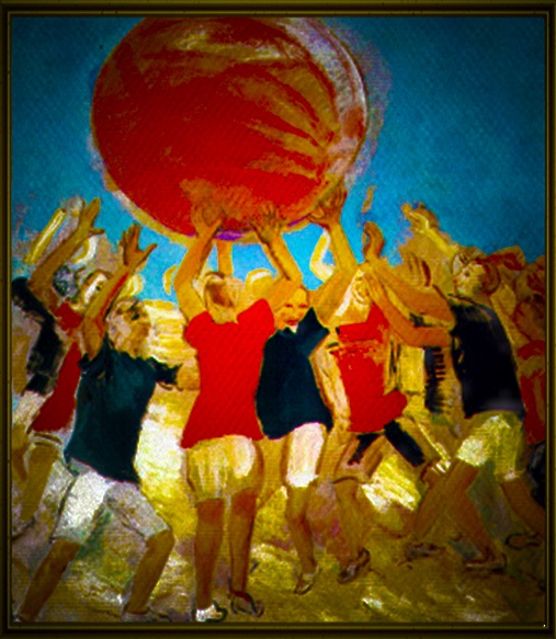 Названия не нашёл. Художник Павел Кузнецов. Был символистом в начале ХХ века. Борисов Мусатов на него когда-то повлиял. Я искал, что бы могло мне шепнуть, как это его угораздило такую ослепительность нарисовать такими тусклыми красками. На самом деле поиски были суетой: вдруг я смогу что-то внятное сказать по поводу того, что такой необычный цвет для воды он придумал. Или меня пронзило, что тень от ребёнка и женщины никак не продлилась в воде. Или что такая зеркальная гладь воды у самого берега, тогда как в нескольких шагах от него уже на воде есть рябь. И потом сырой песок же виден – то есть только что, минуту назад, он был под какой-то микроволной… А миг прошёл и – зеркало-вода… Что меня так взбудоражило? Декоративность? "Этот удивительный художник всегда склонялся к монументальности” (http://vladimir71.mirtesen.ru/blog/43559950431/Hudozhnik-Kuznetsov-Pavel-Varfolomeevich). И монументальность ведь режется с жанровой картиной, а тут именно жанр: семья на пляже. Или он хотел крикнуть: “Счастье!” Именно крикнуть, и потому – монументальность… Нет. У меня не хватит никаких слов, чтоб передать, что у меня в душе творится от смотрения на эту репродукцию. От прилива счастья слепнут, наверно. Не потому ли тут такая нерезкость. Лица могли б быть лучше видны. Однако, какая ж нерезкость, когда все контуры аж обведены? Фигуры очень скульптурны, как из отполированной светлой бронзы. А в то же время ощущение марева. Воздух, чуешь, дрожит от жары. Именно воздух. Он тут какой-то густой. В обычном – тени резче гораздо. Всё контрастнее. А тут всё как в дымке. Парит. А пляж, наверно, бесконечно длинный, прибалтийский. Песок не раскалённый, не сковородка на огне, как на Чёрном море. И просторно. Или не дымка, а как сквозь ресницы смотришь на всё. Я вспоминаю, как я надцатилетний лежу на пляже, одуревший от жары, на спине, набросив на голову шёлковую рубашку, отчего солнце пробивается так, что выглядит, как радужные звёзды. И никаких мыслей в голове. Понятно, почему книга отложена. – Тупо смотрит перед собой и парень на картине. Тупо несёт с собою куклу девочка, и тупо тянет маму к воде. А мама тупо подчиняется и даже направляет. Всё – сермяжность. А художник, как Бог с неба, смотрит и радуется, как он хорошо всё устроил. Знать бы хоть дату создания… Что за благое время? Умер он в 1968-м. Время застоя, так называемого. Я говорил тогда лентяйкам-сослуживицам: вы живёте, как в раю; а знаете, что из рая-то – выгнали? А тут – рай. Женщина в бикини, но пупок ещё лишь чуть открыт – 60-е годы это. Я с толстой книгой, как у этого парня, тогда на пляж на речку в воскресенье хаживал, хоть мне и удивлялись. Время моей молодости. Не его ли чуя, я так волнуюсь? "Мастеру Кузнецову свойственна некая отличная от остальных созерцательность” (http://opisanie-kartin.com/opisanie-kartiny-pavla-kuznecova-mirazh-v-stepi/). Точно. Тут уж хотя бы тем это выражено, что горизонта нет. "…человеческие фигуры, будто случайно увиденные мастером, специально выполнены немного размыто и расплывчато, будто привиделись не только художнику, но и впоследствии зрителю” (Там же). Точно. "…поток гаммы цветов. Такая техника создает особенный матовый стиль, наполняя картину свечением” (Там же). Точно, хоть написано о совсем другой картине. Но свечение свечением, а здесь же оно – тусклое! Что если?.. Жутко подумать… Что если это про скуку обычной жизни? Не до предвзрыва от тоски доводящую, как у читателей