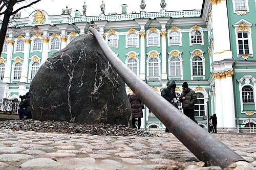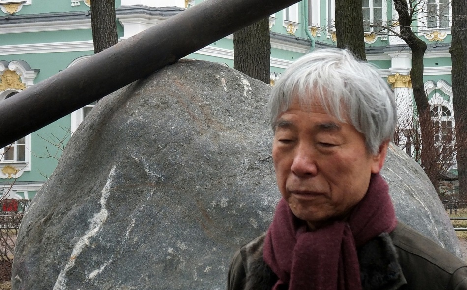 Чуждость человеку – да, есть всюду. На одной презентации Ли Уфан сказал, что на него огромное впечатление произвела “Шинель” Гоголя. Вот я и подумал, что иная фраза оттуда, изображающая ничтожность маленького человека, вполне годится для намёка на отчуждённость, столь поразившую Ли Уфана в ХХ веке. "Ничего нет сердитее всякого рода департаментов, полков, канцелярий и, словом, всякого рода должностных сословий”. Эти слова отлично соотносятся с возмущением против отчуждения, порождения капитализма, против которого так напрасно восставали молодёжь и студенчество в 60-х годах прошлого века и которое, отчуждение, осталось непобедимым. "Речь идёт… о людях, представляющих собой нечто среднее между интеллигентами и неинтеллигентами… Можно определённо утверждать, что в большинстве случаев это люди, являющиеся интеллигентами только по их “статусу” (по службе, социальному происхождению или просто по общественным притязаниям), но не по признанию, не по своей фактической… позиции по отношению к ценностным предпосылкам духовной культуры. Это – своего рода люмпен-интеллигенция, потому-то, как правило, её кумир – “интеллигент-расстрига”. Дело в том, что научно-техническая революция… сопровождалась в капиталистических странах резким падением социального статуса и, соответственно, “престижа” достаточно широких групп интеллигенции… Одновременно с резким количественным увеличением интеллигенции произошло не только драматически переживаемое “низведение” определённой части интеллигенции (“белые воротнички”) до уровня рабочего класса (“синие воротнички”), но и то, что можно… назвать “люмпенизацией” некоторых категорий интеллигенции, оказавшихся в положении, очень близком… к положению “люмпен-пролетариев”…” (Давыдов. В кн. “Теории, школы, концепции”. М., 1975. С. 247-248). Повторилось то, что было с российским миничиновником Акакием Акакиевичем Башмачкиным в XIX веке. Но если у Гоголя с этим Башмачкиным, у студентов США, Европы и Японии происходит взрыв – "Левое движение в Японии стало массовым в конце 1960-х. …массовые акции протеста начались в университетах Токио, Киото и других крупных городов страны” (http://rusplt.ru/world/krasnaya-armiya-yaponii-poslednie-boeviki-internatsionala.html)... То у Ли Уфана видим уже реакцию на поражение этого бунта. Ничто нельзя улучшить! И надо ото всего абстрагироваться. Вот, как можно здорово развить пару слов Ли Уфана о роли “Шинели” для его судьбы… Но это развил я, а не он. А его и слушать не нужно. Настоящему художнику (испытывающему мироотношение своё и своего восприемника) не дано прямыми словами то, что он хотел сказать своим произведением. Ибо то находилось в его подсознании. А там слов нет. Когда автор слова из себя всё же вытягивает, то лучше б уж он молчал. Смотрите: "То произведение, которое мы сегодня установили [“Трость титана”] в Эрмитаже… Значит вы видели, это небольшая скала, небольшой камень и большая железная трость. Это произведение было экспонировано в прошлом году в садах Эрмита… в садах Версаля. Мотив… Это можно сказать, что посох Моисея. Я назвал это произведение “Отдых”. Другое название у этого произведения “Посох Разума”. Ну представьте себе: титан, великан, который на минутку решил отдохнуть и облокотился на эту скалу. Для этого… Какие я выбрал для этого предметы. Значит, я выбрал прежде всего материалы: каме