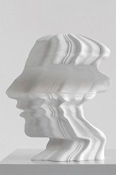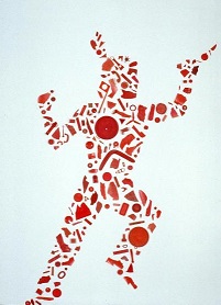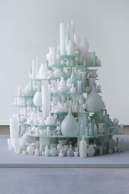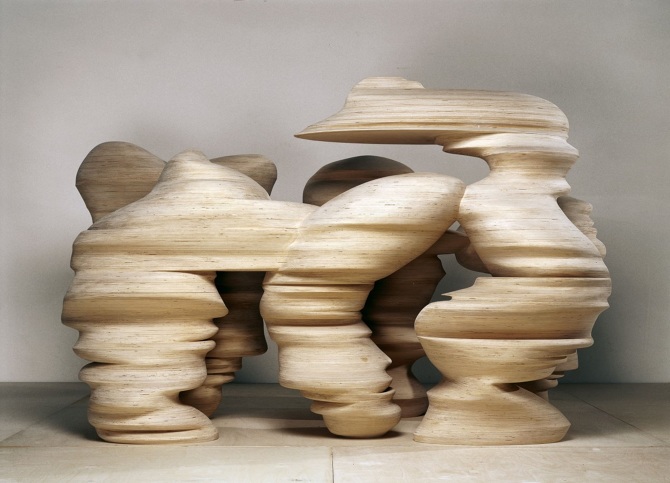 Крэгг. Разбитый пейзаж. 1998. Ничего тут не разбито. А терпеливо одинаково окрашено. Ради скучного впечатления, наверно. Преодолевающего колоссальное разнообразие. Тут уже явное столкновение однообразия с разнообразием. Которое даёт это вожделённое ЧТО-ТО. Подсознательное. Но что? Я ещё полвека назад читал у знаменитого Панофского, что знаменитая “Меланхолия” Дюрера так ещё и не понята. – Тот же ли перед нами случай с “Разбитым пейзажем”? Пейзажем обычно называют природный вид. А тут никакая не природа. И никакая не разбитость… Не протест ли тут против вещизма нынешней эпохи, эпохи Потребления? Ну зачем, мол, столько?!. Оно ж – от душевной пустоты, как пуста эта посуда при всей оригинальности каждого предмета. Непонятность, видно, понравилась Крэггу. "На протяжении 90-х Тони Крэгг продолжал развивать две большие группы работ, которые пополняются и сегодня. Это “Ранние формы” и “Разумные существа”” (http://2queens.ru/Articles/Dom-Hudozhnikov-Skulptory/Toni-Kregg--odin-iz-samyh-izvestnyh-sovremennyh-skulptorov.aspx?ID=3224). Под “Разумными существами” я понимаю протест против рационализма, который уродует людей, заставляя приспосабливаться до потери самобытности и естества своего.
