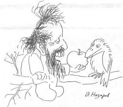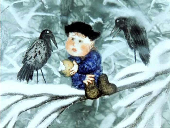 Я получил такой упрёк, заставивший меня посмотреть не виденную раньше “Сказку сказок” (1979) Норштейна: "…примеры такой вольной или невольной эстетической слепоты, которая, например, тому же Норштейну позволила в его "Сказке сказок" ничтоже сумняшеся перелицевать русскую народную колыбельную про волчка! Ведь это только на первый взгляд невинный эстетический выверт, а по сути-то глумление над русскими дурами-матерями, которые тысячу лет предостерегают детушек супротив волка, а оный-то якобы на самом деле исключительно добр и толерантно ПРОдвинут вроде нынешних ракет США вокруг России, не так ли? А где бы был сам-то Норштейн и все Ваши соплеменники, если бы русские дети не были воспитаны давать отпор волкам?” (Игорь Семиреченский). Статью, как видите, я предварил эпиграфом, в чём-то перекликающимся с упрёком. В чём перекличка? – В ограниченности временем. Автор эпиграфа весь на стороне послевоенной эпохи, эпохи перед развалом СССР, автор упрёка весь на стороне путинской эпохи, когда Россия опять сосредоточивается. А у меня позиция вневременная (за что я и получил упрёк). Для меня важна не верность своему времени, а то, движим ли был автор идеалом подсознательным или осознаваемым. Если осознаваемым – это искусство второго сорта, хоть и дающее эстетическое наслаждение – если в нём есть экстраординарность. Если подсознательным – это искусство первого сорта. Для него (и только для него) я предлагаю применять слово художественность. Как отчленить одно от другого? – У первосортного по крайней мере я чувствую, что есть ЧТО-ТО, непередаваемое словами. Если помучиться, может озарить. Тогда будут и слова-намёки, зачем автор то и то и то и ещё много что сделал так. Я мультик посмотрел – явно есть ЧТО-ТО. И слов у меня – нет. Но я надеюсь, появятся по ходу писания. Если честно, у меня за время от смотрения фильма до, вот, писания уже стало что-то брезжить. Одно – точно: “Живём”. – Это слово из заявки авторов на создание мультфильма (тут - http://www.pereplet.ru/avtori/norshteyn.html). Но тут у меня сразу вопрос к себе на засыпку: а как быть с тем, что едва ли не всё у Норштейна началось со слова “Живём”, ведь оно исключает подсознательность идеала? Подсознательность – бессловесна. Я буду выкручиваться поблажками себе. Первая – такая. Слово может появиться просто не сразу, а через какое-то время после чего-то с участием подсознания. Как факт, Норштейн сам признаёт: "Он жил во мне, этот фильм, задолго до того, как я вообще подумал о том, чтобы заняться режиссурой. У меня есть этюд, живописный этюд, сейчас уже не помню точно, какого года: когда заканчивал художественную школу или чуть позже, когда уже пришел на студию, но этот этюд - вороны на дереве под снегом” (Там же). Так я себе думаю, не началась ли та ворона ещё с наброска его соученика по художественной школе, Э. Назарова.
