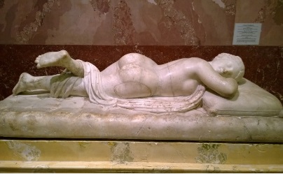 Римская копия по греческому оригиналу III - II вв. до н.э. "Гермафродит, в греческой мифологии сын Гермеса и Афродиты, который воспитывался наядами (в греческой мифологии дочери Зевса, нимфы рек, ручьев и озер) на горе Ида во Фригии. Этот златокудрый юноша необычайной красоты, купаясь в водах источника, возбудил страстную любовь Салмакиды, нимфы этого ключа, но ее мольба о взаимности не нашла отклика и безутешная нимфа попросила богов о вечном единении с любимым. И боги слили нимфу и Гермафродита в одно двуполое существо” (http://www.virtualarchaeology.ru/pdf/87_05way.pdf).