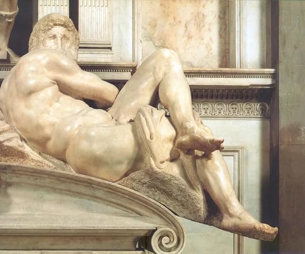 Микеланджело. День. 1534. Мрамор. В смысле – действительность полностью безнадёжна для будущего, даже и исторического; разве что сверхисторическое будущее мыслимо благим для всех. Заразились выкрученными позами и вседозволенщики.