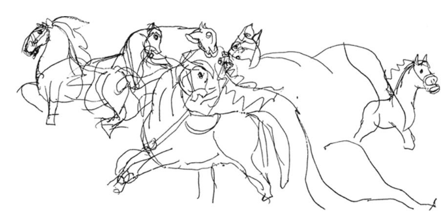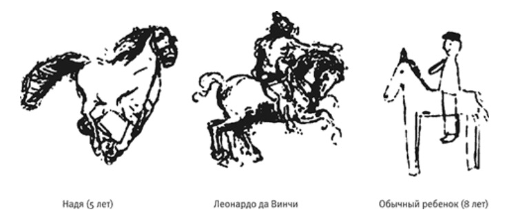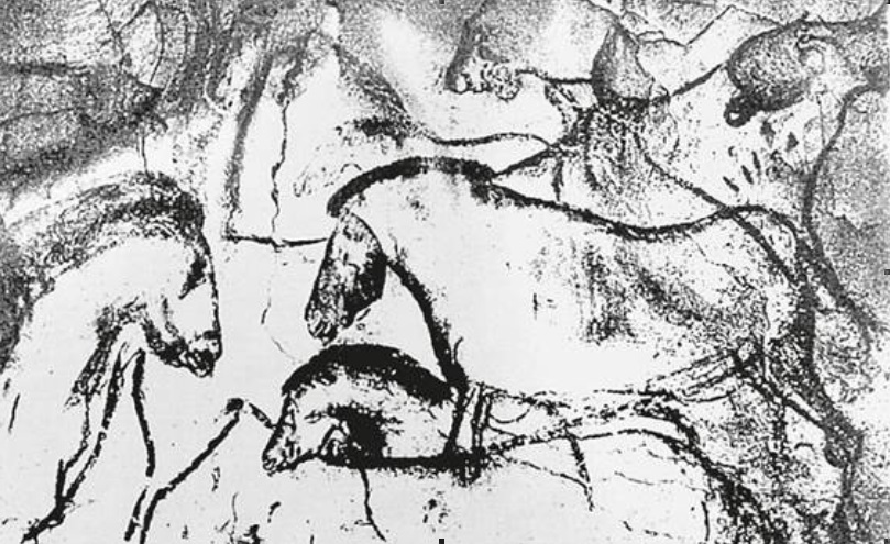 Изображения лошадей в пещере Шове. Более 30.000 лет назад. изображения которых высоко оценили даже профессионалы” (Кандел. Век самопознания. М., 2016). В чём индивидуальность лошадей у Нади? – Самая левая, например, горбоносая как бы. Правее ее и правее и ниже – как бы курносые. Крайняя правая и левее её (повёрнутая на 90є) – как бы прямоносые. Крайне левая с более гордой осанкой, чем крайняя правая. Вторая слева без гривы. А как в пещере Шове? – У центральной нос с горбинкой. Под нею – курносая. Левее – прямоносая. У центральной грива коротким ёжиком, под нею – подлиннее. С этим натурализмом изображения Куценков идёт за помощью (в связи "с дисфункцией левого полушария мозга”) к Поршневу. Тот не только дал мощнейшее обоснование компенсаторной (можно то, что нельзя) идее возникновения искусства, но и связал натурализм с недоразвитием "речемыслительной деятельности ископаемых людей в конце палеолита” (Поршнев. О начале человеческой истории. С.-Пб, 2007. С. 465). И, опираясь на Надю из Ноттингема, Куценков о компенсаторной идее забывает. И верно. Через 17 лет после смерти Поршнева была обнаружена пещера Бломбос с орнаментом из прямых линий на куске охры 75.000-летней давности. А через 32 года после его смерти нашли ожерелье из ракушек в Африке и около неё. – Никакого натурализма. И без этих открытий связь "с дисфункцией левого полушария мозга” выплывала на первый план. Но Куценков закрывает глаза на то, что 75% рисующих были взрослые женщины. (Определено это было так. Женщины тех мест и в то время имели иное, чем у мужчин соотношение длины безымянного пальца к указательному. А рисовавшие портреты животных женщины рисовали заодно и “портреты” своих ладоней, и ладоней своих детей.) Обязательно ли надо всем людям того времени иметь дисфункцию левого полушария? – Совсем нет. Достаточно думать, что просто у человечества, чем дальше назад, тем больше народа оказывалось с недоразвитием "речемыслительной деятельности”, и женщины, с какого-то момента начиная, стали тренировать детей на абстрагирование. А чем ближе вперёд по времени, тем меньше детей рождалось с этой дисфункцией. В конце концов такие рождения стали редкостью и натуралистическое изображение, делание двойника, или абсурда "то же, но не то же” (Поршнев. С. 466), перестало быть нужным. Как я до этого додумался? Я вспомнил, как к нам в гости приехал уже взрослый троюродный брат моего ещё довольно маленького сына. Я – непозволительно хлопотливый и старающийся за сына сделать, кажется, всё – тогда достал нескольколетней давности фотографию, где по росту стоят все троюродные братья, где приехавший – первый, а мой – где-то в середине строя. Я показал фото сыну и – позорно – сказал ему, указывая пальцем на живого и на фото: “Смотри: вот Дима и вот Дима”. Будто сын мой идиот. Чем взбесил жену. Так вот то делание двойника палеоженщинами было тем же самым. Только те, умницы, делали это предосудительное действо со своими умственно отсталыми благоразумно. В отсутствие мужей (ушедших, скажем, на охоту, и потому всё животных рисовали). И в самых дальних и тёмных, секретных уголках пещер. Чтоб никто из рода не знал и мужчинам бы не донёс. (Тем объясняется странное расположение пещерной живописи в потайных местах. Не зная поначалу о женском преобладании в изобразительном творчестве, я было думал, что это пацаны, которых взро