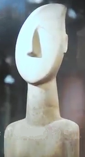 Кикландский идол. Ок. ХХХ в. до н. э. Мрамор. "…все их находили в могилах” (http://www.barabass.ru/articles/p2_articleid/705). Как другие народы хоронили оружие и еду вместе с трупом. В расчёте на загробную жизнь. Теперь, что писал Юнг? "Сознание требует для своего поддержания значительного усилия. Человек устает от пребывания в сознательном состоянии. Он истощается сознанием. Когда наблюдаешь представителей первобытных племен, то можно заметить, что на малейшее раздражение, выводящее их из дремоты, они стараются исчезнуть. Могут сидеть часами неподвижно, когда же их спрашиваешь: “А что вы делаете? О чем думаете?” – они обижаются и говорят: “Только сумасшедшие думают – они держат мысли в своей голове. Мы не думаем”” (https://www.litmir.me/br/?b=88184&p=2). Древнейшие греки могли смерть считать родом сна и считать, что при “пробуждении” субъект не умеет совершать главное умение, которого “недавно” у людей не было. По крайней мере, у детей его поначалу явно нет. – Это умение создавать идеи. Мне понравился пример, иллюстрирующий, что такое идея. Вот палка. Начнём её стругать ножиком. Она уменьшается, уменьшается, и исчезает. Но идея “палка” ведь не исчезает. Она, пожалуй, существовала ещё и до выламывания ветки, из которой сделали палку. И, чего доброго, идея существовала всегда. Но последний нюанс мысли приходит попозже. А много раньше идеальное, может, ещё у долюдей было, до выделения из неоантропов людей. Это МЫ, стадо. Персонифицирующееся в вожаке, невероятными криками держащего всех в порядке. Так – из-за имитативности – так кричать могут все. Но нельзя! Значит, существует что-то… Невидимое (звук же невидим и тогда, когда произнесен, и тогда, когда только потенциален и известен каждому молчащему индивиду этого стада). Так поначалу то идеальное – внешнее каждому субъекту. Потом люди выделились. И у них почти не было языкового мышления (которое как-то близко к идеальности; не зря в Библию вошло выражение: “В начале было Слово”). И лишь много-много спустя они обнаружили, что они, каждый взрослый, являются источниками идей. Идеи “лицо”. Идеи “нос”. И так далее. И это умение создавать идеи – обретается с возрастом. И… может быть утеряно умершим-как-бы-уснувшим. Так что ему поможет, воскреснув на том или этом свете, опять научиться создавать идеи? – Мраморная (долго не испортится) скульптура, положенная рядом с трупом в могилу. Причём скульптура эта надо, чтоб была зримым образом именно идей (лица, как чего-то круглого, носа, как чего-то торчащего из лица). То есть это – своеобразный учебник для оживших. А совсем не испытание сокровенного у живых. То есть не неприкладное искусство. А вполне себе прикладное. Призванное усиливать умение создавать идеи. Нисколько не имеющее отношения к подсознательному идеалу. Наоборот, призванное восстанавливать сознание после как бы сна. 20 января 2018 г.