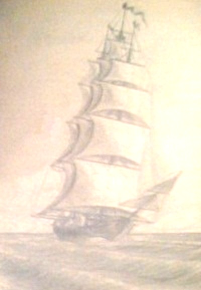 В том изображении, что перед вами (нерезком, уменьшенном, бледнее оригинала) о рисовальном искусстве говорить, очевидно, нельзя. Море – не водяное, сети на бушприте – не сети, кливера – еле видны. Видится мираж, а не якобы реальность, как хотелось.