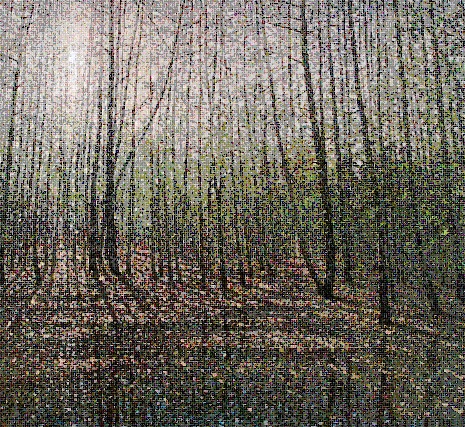 Крылов В. Май # 3. 1995. Холст, масло. Что вид природы не имеет отношение к социуму, сказать нельзя. Тот же Шишкин рисовал, собственно, не лес, а парадоксальную мощь русского народа, когда другие как раз, наоборот, плакали о его несчастности из-за освобождения от крепостного права без земли и из-за наступления безжалостного капитализма. А численность народа резко росла. И Шишкин это как-то чуял и плевать хотел на плач окружающих его интеллигентов. – Реализм. Что Крылов тайно для своего сознания имеет пристрастие к Вечности, говорит его обращение ко всем известной вечной славе гениев искусства.