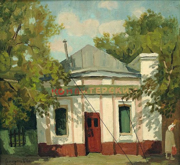 Парошин. Булочная 1994. Да и левый край домика явно больше наклонён влево, чем правый… Да и на вывеске КОНД не может быть таким покрасневшим жёлтым из-за того, что попало в тень…