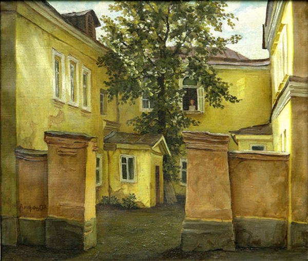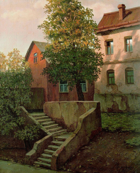 Парошин. Дом Тарковского. А ведь так и есть (проверил по гуглокарте): "Первый Щипковский переулок, 26, кв. 2. По этому адресу был когда-то расположен уникальный дом, принадлежавший трем поколениям семьи Тарковских… Дом напоминал отчасти барак из-за длинного коридора, делящего его на две части… Дом был построен в 1870-х годах мещанином Гавриловым и крестьянином Елохиным. Нижняя часть оригинального дома была каменной (заложена еще в 1878 году), а верхняя деревянной (надстроена в 1912-м), из-за чего дом неоднократно горел. На рубеже 1980–1990-х годов дом принадлежал Кинофонду, который снял крышу, предполагая начать реставрацию. В 1987 году после смерти режиссера дом было решено снести, так как он пришел в негодность… 20 июня 2004 года дом снесли полностью, даже не известив об этом родных режиссера” (http://snip1.ru/moskovskie-kvartiry-v-kotoryx-zhil-andrej-tarkovskij/). Я на Парошина вышел из-за поиска, кто написал такую картину: