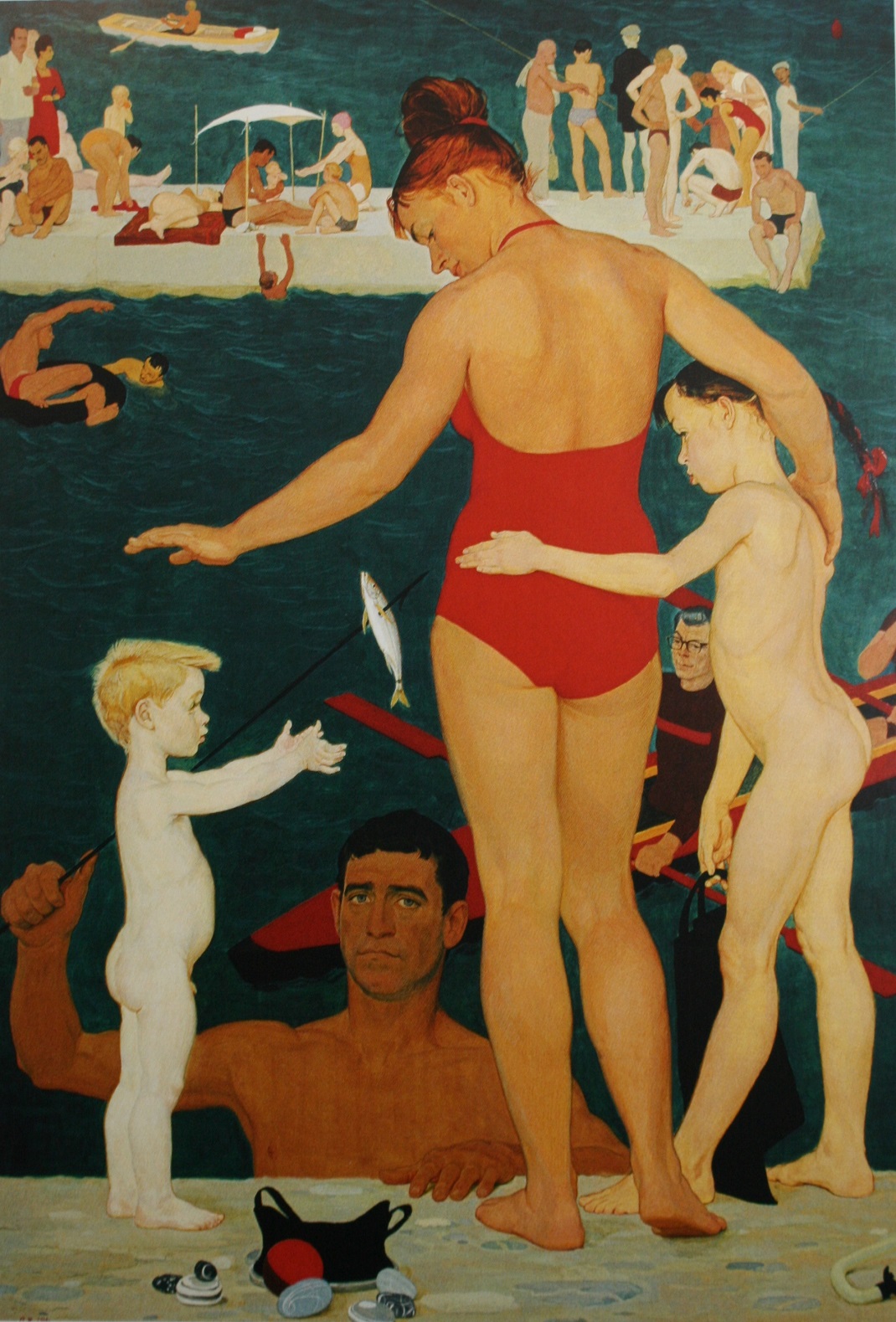 Жилинский. Гимнасты СССР. 1964-1965. Оргалит, синтетические смолы, темпера. Художник смотрит на спортивные состязания не обывательски. Его взгляд исходит из среды самих спортсменов, озабоченных предстоящими соревнованиями. Поэтому на первый план опять-таки выходит человеческая характеристика спортсменов, их воля, сосредоточенность, собранность. В картине присутствует редкий изобразительный мотив: спорт показан не в движении, а в статике. Но статика как раз и позволяет сосредоточиться на лицах спортсменов. Фигуры в белых одеждах выделяются на красном напряженном фоне. Все прописано плоскостно, а объемы обозначены легким оттенением белого цвета. Композиция строится по линии синусоиды, согласно двум планам – крупному нижнему и мелкому верхнему. Разнообразие ритмов сообщает картине “Гимнасты” некоторую скрытую подвижность. Мастерство и техника исполнения, свобода обращения с локальным цветом и ясной композицией направлены на выявление и художественную передачу, но не просто светлого ощущения жизни или частного, случайного момента, как в фотографии, а выверенного образа времени”. Так с чем я не согласен у Манина? – С словами "не обывательски”. – Ведь, если "индифферентность к общественным борениям”, то как может быть "не обывательски”? Нет, вообще говоря, в моей “базе”, СИИ, представляющей из себя Синусоиду Изменения Идеалов, типов идеалов целых 6 минимум. Из них только один – обывательский. На нижнем перегибе Синусоиды. Все остальные – общественно не индифферентны. Просто в СССР, да и теперь инерция осталась, обыватель – это что-то почти ругательное. Россия – страна обществизма, коллективизма. В менталитет даже вошло. И когда Пастернак воспел Мещанство в “Докторе Живаго” (1945 – 1955) все не только притворно раздражились. – Хрущёвская оттепель ещё не распогодилась. И потом выраженное живописью более скрыто от понимания. СССР-то был с самого начала страной с численным преобладанием мещанства, с идеалом типа Польза Себе. Но в самом начале была массовая сильная инерция Великой Октябрьской революции, замахнувшейся было на создание нового общества и нового человека. Замах оказался самообманный. Но инерция самообмана долго не угасала. И как только появилась какая-то духовная свобода в хрущевскую оттепель, так воспевать стали и Мещанство тоже. То ничего, что картины Жилинского появились уже при реакции на ту оттепель. – Поди распознай, что обывателей он воспевает. Вон, Манин и через 40 лет картинам отказывает в обывательстве. И относит плоскостность письма всего лишь к индивидуальной пластической стилистике. Вот такой он, Жилинский. А он не просто такой. Он учитывает общественную самообманную привычку считать мещан не глубокими людьми. И – наоборот – на пути наибольшего сопротивления – взялся возвеличить то, что называют – по-стадно-советскому – плоским. Он, чего доброго, и сам не осознал своего бунтарства. Но его подсознательный идеал, выраженный такой необычностью, как плоскостность, передался – в качестве необычности – подсознанию всех. И… Его работы "выделяются на общем фоне”. Но про какую "полноту жизни” можно говорить, глядя на лицо отца семейства, добывшего для развлечения детям рыбку подводным ружьём? Манин не зря вспоминает про "заливку”. "Заливка - прием, выполняемый в тех случаях, когда требуется прокрыть значител