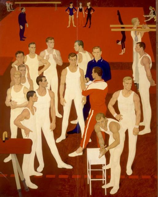 Но прав ли я? – Меня поразила плоскостность письма и негативная аура слова “плоский”. Но есть же замеченное Маниным, но мною необъяснённое. Скажем, напряжение красного фона, контраст крупных фигур переднего плана с мелкими – заднего, "свобода обращения с локальным цветом”. В самом деле – свобода. Такой спортивный снаряд, как конь, кожей оббит. А та коричневого оттенка бывает, а не красная. Линии разметки в спортзале не могут быть розовыми, почти не отличающимися от красного пола. Зачем они, если мало заметны? Но всё нормально, если нужно спортивное напряжение иметь в виду. А так как дан контраст будоражащего красного со спокойным белым, то можно думать, что воспета свобода от напряжения. Опять неработизм некий. Для того и мелки фигуры заднего плана, что там тренировка не прекращена. Саму "скрытую подвижность” можно объяснить ценностью свободы от озадаченности.