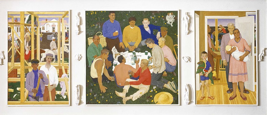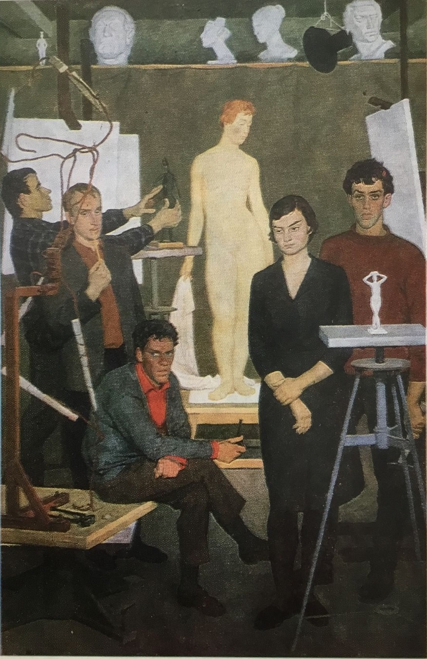 Жилинский. Групповой портрет студентов-скульпторов. 1964. Тут опять неработизм. Один только, крайний слева, чем-то занимается, но явно не творческим. И как-то не скажешь, что они, каждый, в своей душевной глубине мысленно копаются – какая-то общая отстранённость на их лицах. – Прервались… – Хвала абы какому моменту жизни. Словно их окликнули сфотографироваться. А не призваны они участвовать в общественных борениях.