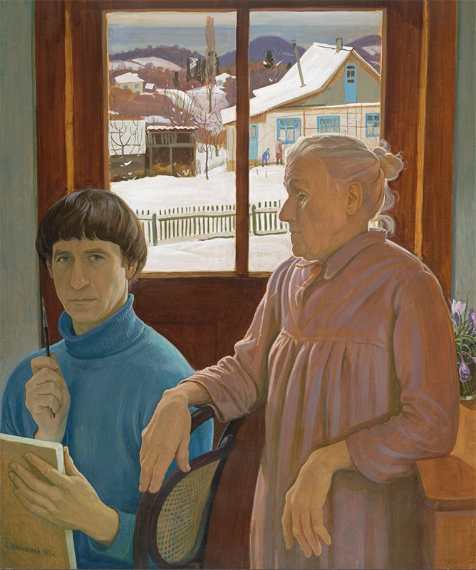 Жилинский. Автопортрет с мамой. (Зима на юге). 1974. Что пишет об этой картине Манин? "Поистине классической работой высокого ренессансного духа явилась картина “Зима на юге” (1974). Строгое лицо художника (это автопортрет) и портрет его матери с четко прочитываемым профилем, данным в контровом свете, исполнены темперой, глухой тон которой позволяет материально, осязаемо передать неосвещенные цвета синего свитера и коричневого платья, окаймленных светлыми контурами струящегося из окна зимнего света. Ренессансная строгость образов, подкрепленная скупостью пейзажа, рождает ощущение значительности персонажей и витающего над ними духа сурового времени. В сюжете видится нечто итальянское, хотя изображена зимняя кавказская природа. Но приемы с окном – оттуда, из Ренессанса. Образная перекличка времен очевидна”. Самое сомнительное тут выражено словами: "скупостью пейзажа” как "духа сурового времени”. Все знают, что северо-кавказская природа ("Родился в Волковке Северо-Кавказского края” - Википедия) совсем не сурова (мягкость зимы прямо чувствуется – в тёплых оттенках в изгороди, в деревьях, в проталинах). И 74-й год напоминает о времени блаженного брежневского застоя, совсем не сурового. (И всё-то Манин пишет наоборот…) А тут опять изображён отдых от художнической работы. Ну кем могла быть его мать в селе? Пусть и жена репрессированного в 1937 году… О чём художник может общаться с матерью по поводу нарисованного? – Я думаю – не о высоких материях. Которые, невысокие, и были идеалом Жилинского. И превращались в нечто с заглавными буквами – Низкие Материи, которые сродни виду из окна… Что – заглавность – и видно в гордой осанке изображённого художника. С Ренессанса, да, начали изображать окна в картинах. Но не из-за общепринятого ли идеала того времени – Гармонии – по большому счёту вспомнил Манин тут о Ренессансе, если реально тут большие буквы просятся для Низких Материй? – Не знаю. В Ренессанс всё же Мадонн изображали для гармонии высокого и низкого. И вернее, по-моему, думать, что Манина занесло тут с Ренессансом. – Даже и с большой буквы Низкие Материи ниже идеала Гармонии. И какая же "строгость образов” в Ренессансе, если в пухленьких младенцев Иисусов впиться губами в поцелуе хочется… – Манина сбила, наверно, с толку серьёзность лиц обоих портретируемых. А она дана для, так сказать, заглавности того, что именно "материально”, а не духовно: свитер, платье. Светятся ж они, одежды, хоть и нарисованы "в контровом свете”. И для того же "материально” подснежники в стеклянной банке втиснуты в картину. Весна тут, а не изображение "духа сурового времени”. Хвала опять абы какой жизни. Не творческому взлёту художника или сотворчеству его мамы. Они оба как бы не тут, а ведут жизнь автоматов или животных, не думающих.