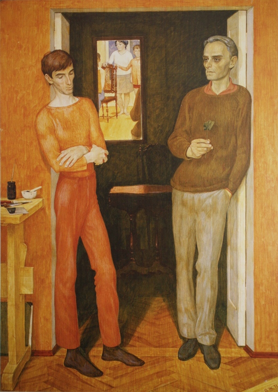 Жилинский. Два художника. 1971. Ну как у него рука поднялась такое написать? Нету тут заливки на стенах, на одежде, на обуви, но разве это позволяет писать про детали. На обуви, например, шнурки были б видны, а их нет. Брюки было б понятно, из какого материала сделаны. Неужели ножик, пестик с чашечкой, баночка и ещё что-то на столе позволяют? Или резные детали стула? По-моему тут большее значение имеет противопоставление аскетизма художников (их худобы и утрированной вытянутости) кубышке-женщине и безликости-никчемности в комнате, из которой эти двое почти убежали. От скуки там. От быта. Ну и чем занимаются тут их духовные превосходительства? – Молчат. – Это опять абы какая жизнь. Персонажи-то, может, и невысокого мнения о такой. Но автор! – Раз он именно это – безмыслие – подловил и удостоил увековечения… Введение “художника” в название имеет такую же роль от противного, как “СССР” в “Гимнастах”. Здорово о Жилинском написал Анатолий Никич: "Жилинский, на мой взгляд, одарен особым талантом портретиста. Он создает "портреты" цветка, дерева, дома, а не только человека. Он во всем ищет и находит самые узнаваемые и самые неповторимые, особенные черты, заставляя нас верить в безусловное существование на земле именно этих растений, этих предметов, этих людей, ощутить их уникальную индивидуальность в своем роде и всегда красоту” ( https://www.liveinternet.ru/users/5006355/post265862512/).Это не противоречит Низким Материям. Я б только заменил красоту на ценность существования кого (чего) бы то ни было.