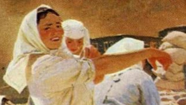 Яблонская. Хлеб. 1949. Соцреализм, понимаемый как улавливание прогрессивной тенденции в социуме. В построенном так называвшемся социализме ешё труд не стал первой потребностью, как твердил догматический марксизм, зато он таким уже становился. Мол. И – радость. А как радость – так активность цвета. И – пожалуйста: жёлтое сияет. И этой картине в 1950 была "присуждена Сталинская премия II степени. Картина также была награждена бронзовой медалью Всемирной выставки 1958 года в Брюсселе” (Википедия). Художники её хорошо знали. Эрудированные зрители, думается, - тоже. И поэтому заявление Дьяконицыной просто безответственное ля-ля, получается? Или дело в сочетании активного цвета с неожиданным чем-то (скукой абы какой жизни) "Зрителей тогда поразило”? – Сравните лицо колхозницы, счастливой в труде