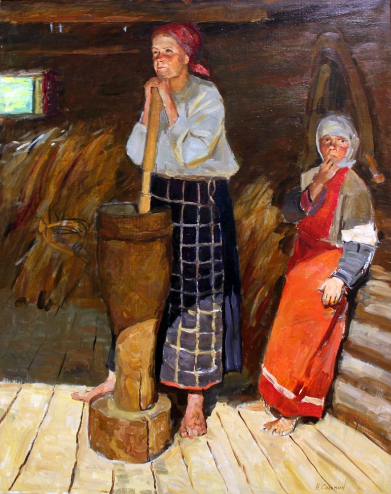 Соломин. Из детства. 2011. Толкут просо. А из проса пшено, и из пшена каша… Совсем недавно создана вещь, когда вполне оформилась в мире антиглобалистская тенденция – традиционализм. Но Соломин, пишут, давно обратился "к историческому прошлому… пейзажи…. чисто русские как по сюжету, так и по его трактовке, по эмоциональному восприятию изображаемого мотива. Особое внимание художника привлекают старые церкви…” (Манин. Русская живопись ХХ века). То есть и когда вместо нынешнего глобализма был советский активизм, Соломин был как бы в оппозиции. В общем, все фазы эпохи Потребления его не затронули. А я только что получил взбучку от особы, этой эпохой серьёзно затронутой. Я-де не знаю Россию, как в ней сейчас плохо. И нечего, мол, мне увлекать своими статьями читателей прочь от реальной жизни и прославлять самоограничение. Люди, мол, не такие аскеты, как я. Я смущён. И потом… этот Соломин живописно никак не бросается в глаза. У меня же к нему какое-то тёплое чувство. И вот я перед проблемой: смею ли я перед читателем копаться в своей душе, если сами картины меня… скажем так, ну, не останавливают они моего эстетического внимания. Они такие же невыдающиеся, как тот пафос, какой они выражают. То есть – никакой неожиданности я в них не вижу. Никакой недопонятности. А я ж оправдываю свою деятельность словесным открыванием ЧЕГО-ТО, словами вообще-то невыразимого. С ультратонкостью толкования невыразимого я мог рассчитывать в принципе пронять даже мою корреспондентку, воинствующую потребительницу, недовольную Россией, где 14, кажется, процентов людей живут теперь за чертой бедности. А Соломин бедностью, похоже, гордится.