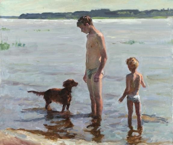 А тут… Даже если это невзрачное советское время изображено, время неконтрастного общества, когда все, в общем, мало чем отличались по материальной обеспеченности… Этот вид как-то настаивает на непритязательности как на достоинстве (другие ж на море летом возили своих детей – плевать). Это явно двое братьев (горожан, раз в плавках) в деревне. Старшего даже в пионерлагерь не отправили. А – к бабушке обоих. И это не хвала абы какой жизни, как у импрессионистов, голодающих, но радующихся бурлящей жизни ужасного тогда капитализма. Это гимн скромности. "В русском языковом сознании скромность должна быть свойственна мыслям, поведению и образу жизни человека и ассоциируется с непритязательностью…” (http://www.dissercat.com/content/kontsept-skromnost-v-russkoi-amerikanskoi-i-iranskoi-lingvokulturakh). Об общей бедности страны даже тени переживания нет. Вещизм тогдашний не всех порабощал. И теперь – тоже. Вот об этом – Соломин. А может, я просто не могу усечь противоречивость “текста” здесь? Бедность, отсталость, непрогрессивность написаны… живописно сочно. А? Да здравствует традиционализм! Я лично совсем не юношей дожил до поворота к нему моего мировоззрения (хоть предрасположен был к нему с детства {я с войны – безотцовщина}). Я повернул к традиционализму, когда хотели повернуть на юг северные реки. В 70-х годах. Во мне родилось какое-то возмущение. В СССР замалчивали работу Медоуза, сделанную тогда же по заказу Римского клуба, о том, что неограниченный материальный прогресс надо остановить. Я её узнал только после наступления гласности. А Соломину, получается, всё было ясно с самой молодости (он на 2 года младше меня). Наверно, это даст мне право считать его реалистом. Он почуял в социуме то, что ещё никому видно не было. Сами церкви – в СССР – были образом скромности.