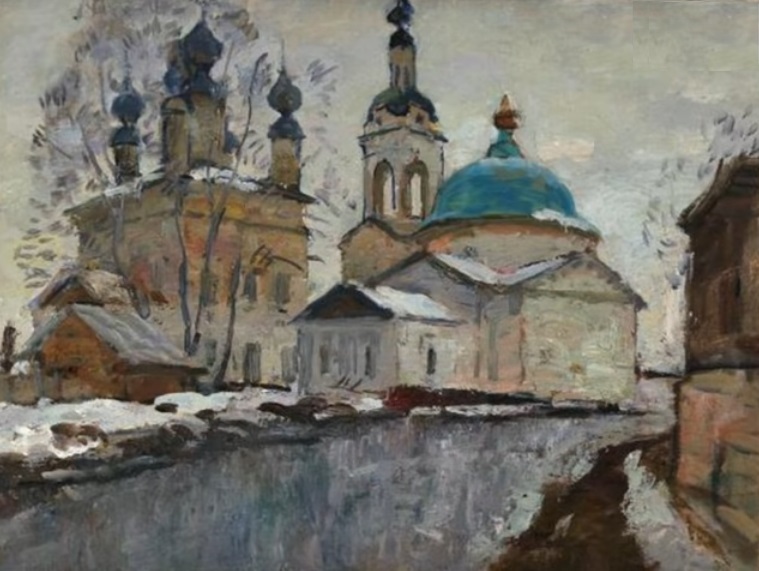 Теперь-то, да, Соломин просто повторяется. Теперь и церковь – чуть не властвующая. Вот сегодня на центральном ТВ появился человек с очень нехорошего вида (жиденькой) бородой и настаивал, что правильно сделала директриса школы, уволившая учительницу, опубликовавшую в интернете свои фотографии в закрытом, но купальнике. – Так что пафос Соломина надо уточнить: да здравствует безрелигиозный традиционализм! Ни штриха протеста не чувствуется в том, что церковь лишена крестов (потому это – явно советское время {опять невозможно найти дату создания}). Церковь – лишена крестов, улица – сплошная лужа, а один из тротуаров непроходим – стал местом свалки снега с проезжей части. Зато как всё вместе это красиво выглядит! Церковь отражается в луже. Радостно, потому что весна идёт! И красота – органически присуща церкви и луже! Что тут – эстетический подход, говорит та формалистская лихость, с которой тут кое-что нарисовано: обводка кое-где контура строений, совсем не нарисованы тонкие ветки не совсем облетевших на зиму деревьев. В нашем городке церковь даже действовала. Перед ней – базар. За ним – школа. И весной непроходимы улицы были. Я раз, идя в школу, в первый или второй класс, провалился в лужу по пояс. И с диким криком, выбравшись, побежал домой. Но я нисколечки не обижаюсь теперь на всеобщую тогда послевоенную бедность. А теперь войны нет. Давно. Есть только военная угроза. Как Югославии. Делайте, как вам велят! Иначе… И оттого всё внимание на военном строительстве. И – на традиционализме, как идейном противовесе либерализму, всех в ХХ веке победившему. Жаль только, не вписан традиционализм в Конституцию РФ. Но его и так молчаливо исповедуют. Надеюсь – большинство теперь (как реакция на дерьмократию 90-х). А моя корреспондентка, тоже надеюсь, по большому счёту не права. Менталитет народа, неприхотливость и скромность, не меняется. Даже и в эру Потребления. Вот такие субъективные рассуждения по поводу репродукций. Рождённые упрёком, что я, не живя в России, Россию уже не знаю. 29 марта 2019 г.