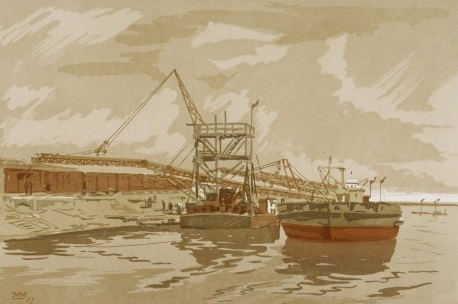 Маторин. Волга. Выгрузка овса конвейером. 1937. Бумага, цветная линогравюра. Казалось бы, противная индустриализация, портящая природу. На берегу что-то набросано. Какие-то доски или что. Страшненькие товарные вагоны. Глинистая вода. Тусклое облачное небо. Оно даже нарисовано кое-как. И всё какого-то нарочито коричневого оттенка, даже небо. Но какая ширь! Какая даль и светлынь там, в небе над самым горизонтом. И какая мощь этих двух дебаркадеров с кранами для подвески одного конца каждого конвейера… А за баржой что: виднеется купол собора? А главное – какое изящество в изображении этих ленивых волн великой реки. Какое разнообразие черт для них избрано: сплошные и прерывистые, тонкие и широкие, змеистые и прямые, потемнее, посветлее и совсем светлые, зеркально отражающие край баржи и дебаркадера и волнисто, в общем направленные в самые разные стороны – слева направо вверх, справа налево вверх, горизонтально. Как будто каждая волна – одушевлённая индивидуальность. Которых не счесть, хоть их восемь по правому краю, всё уменьшающихся, но понимаешь, что их целая бесконечность.. Великая река… Мы любим Россию за величину. И как-то не важно, каково в ней жить, как она обустроена. Даже недуообустроенность как раз и любима. "Кургинян: …иметь и быть. Да? Вот вы… у вас много… ваше потребление выросло, а детей нет. Да вот? Ну как женщина согласится на это? А может, ей эти дети в счастье. Да? Ей нужно будет поделить семейный бюджет не на себя и не на двоих, а на большее количество людей. Жизнь, которая определяется понятием прибыль и потребление, она превращается в совершенно скотское существование. Которое, так сказать, ни один человек никогда на это не согласится. Что вовсе не означает, что люди должны голодать, у них нечего потреблять. И так далее… И последнее. Есть, понимаете ли, государства эффективные, а есть неэффективные. Вот там Дания (или не Дания), она эффективная. Она просто лежит под другими странами всегда. Шведами, под англичанами, под кем угодно. Ну, она под немцами. Она лежит, совершенно маленькая… комфортно лежит под другими. А есть такое огромное неэффективное… страна под названием Россия. Да? Нам… много есть поясов, так сказать… Распластавшаяся. С огромным количеством мест, где не так уж и хорошо проживать… Вечная мерзлота и так далее. Ну такая она. Да? Огромная. Она, может, и неэффективная, но любимая” (Время покажет. https://www.1tv.ru/shows/vremya-pokazhet/vypuski/vremya-pokazhet-vypusk-ot-19-09-2019). И какой же русский не любит Москвы?