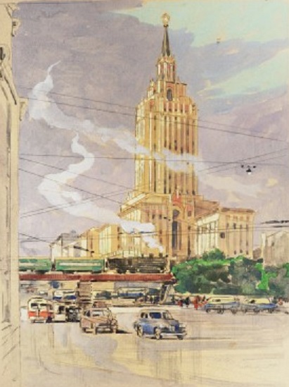 Маторин. Москва. Август. 1953. Картон, акварель, белила. Я не ахти как знаю Москву. Думаю, неужели художник придумал такое неудобье, как во всю дымящий паровоз возле сталинской высотки? – Нет. Не придумал. Это гостиница Ленинградская. – Но так дымить, слушайте!.. – Через четыре года после времени написания картины я посетил Москву и влюбился на всю жизнь. – Какая деятельная суета!.. А этот размах дыма!.. А какой мах ввысь этой высотки!.. А эта бирюза неба!.. А его огромность!.. Раззудись, плечо, размахнись, рука!.. А либералы-глобалисты предлагают лечь под Америку… "Шейнин: В ваших рассуждениях об эффективности российской экономики и нашего уровня жизни и благосостояния Россия совершенно не определена в её границах, и вы готовы отрезать от территории России столько, сколько будет нужно для того, чтобы построить то, что вы считаете правильным. Да или нет? Дмитрий Некрасов: Скорее это будет происходить другим путём. Это будет происходить… Для увеличения качества жизни необходимо будет уменьшать уровень суверенитета этой территории и вхождения её в глобальные… Шейнин: Ваша формула: эффективность потребления и уровень экономики равно и допустимо отказу от части суверенитета. Дмитрий Некрасов: Допустимо, конечно, безусловно” (Там же). Я написал выше: слов нет. – Вот для того и существует искусство. Даже и прикладное, каковым является искусство Маторина. Которое я в радикальном порыве пробивания в общественном сознании мнения, что главное искусство – это не прикладное (о в общем знаемом), а неприкладное (о сознанием незнаемом, выражающее подсознательный идеал автора). До чего ни доходишь в раже… А отошёл, вот, восхищён умением Маторина выразить любовь к родине столь иначе невыразимым образом, как он это делает, и… Не хочется его искусство называть второсортным. Ибо слова “любовь к родине” – сухие. А картины Маторина сочные и неповторимые. Каждая – по-своему. Ну вот такая простейшая картина чем замечательна?