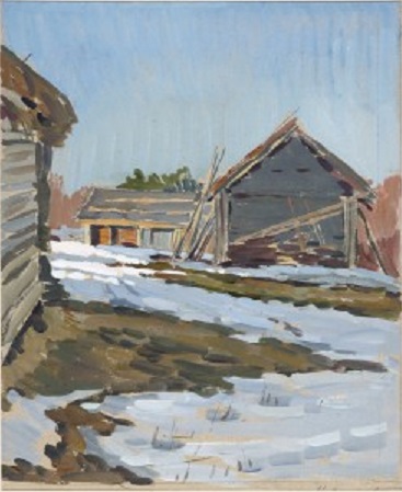 Маторин. Весна. Малеевка. 1941. Бумага, смешанная техника. Не только чисто живописной игрой чередования тёплых и холодных тонов, причём даже и в неожиданных местах. Например, холодные серо-синеватые стены, казалось бы, тёплых строений и светло-коричневые тона снега на переднем плане. Маторин ещё пронзительно наблюдателен. Есть такой эффект – усиленное таяние снега поблизости тёмных стволов деревьев. Стволы солнцем нагреваются и излучают тепло. Снег поблизости от ствола и тает. Так тут, на картине, Маторин настойчиво (из-за чего я и заметил) нарисовал одинаковыми (!) палочками с одинаковым (!) наклоном травинки на переднем плане. И возле каждой – проталина. От той же причины треугольной формы проталина у стены слева. Стена, видно, восточная, её напекло с утра и днём, вот снег возле и растаял. А сейчас – к вечеру: всё справа от этой стены в тени. И потому тени во дворе слева направо. А ещё весна – время ремонта кровли, провалившейся от избытка снега многоснежной зимой. И такая наблюдательность – от неспешной жизни в деревне, хранительнице традиционализма. Пусть время индустриализации где-то и гремит. А чего засветло тут работать кончили? – Ответ (мною укороченный) у Феофана Затворника: “Дело не главное в жизни, главное – настроение сердца”. 20 сентября 2019 г.