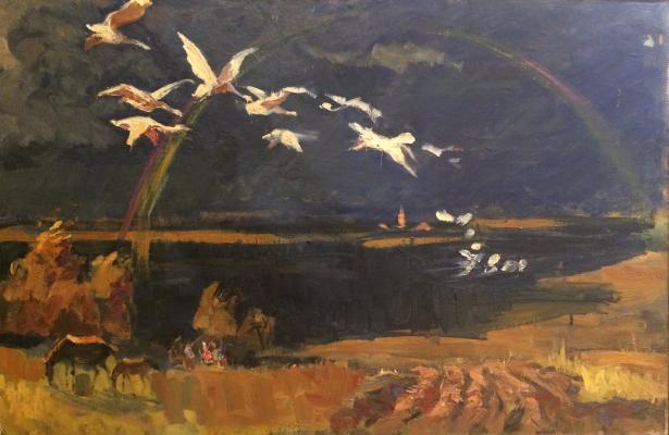 Поддаюсь смахивающей на графоманство пробе что-нибудь увидеть в картинах художника Шурпина. Этот тот, оказывается, кто создал когда-то плакат “Утро нашей Родины” (1946 – 1948) со Сталиным в белом кителе и плащом на правой руке, стоящим на вспаханном бескрайнем поле, - плакат, сияющий оптимизмом. Это когда голод-то послевоенный наступил… Потому “оказалось”, что я смотрел репродукции, прицепленные к файлу “Русская живопись ХХ века” Манина. Подумал, абы кого, наверно, не прицепят в такое место. Не каждому ж иметь отношение к истории отечественной живописи? – И вот среди другого, по большей части не останавливающего на себе моего внимания, я наткнулся на остановившее. Картина приближения чёрной, прямо апокалиптической какой-то грозовой тучи и последнего солнечного освещения широкого пейзажа, видного с высокого берега какой-то могучей реки, а надо всем этим – ломанным строем возвращающаяся с юга стая белых лебедей. Потому с юга, что летят они из-за нашей спины и слева направо (направление изображения облегчённого движения у народов, пишущих слева направо), а правый берег – высокий, и Волга, Дон текут же на юг. Значит, за спиной нашей – юг. И лебеди с облегчением возвращаются домой. И подпись: ““Родина”. 1949”. После голода время. Потому, может, радуга есть от края до края картины. Понимай, кончилась гроза-голод. Уходящая это туча, а не приходящая. Вон, и лошадь с жеребёнком уже пасутся спокойно, пока пережидавшие грозу под каким-то пологом люди этот полог ещё только приподымают и осматриваются. Время, называемое “восстановление народного хозяйства”. Сталинское. И какая-то воинствующая размашистость письма в этой картине. Халтура прямо какая-то. Но подпись – уважительная: холст, масло. Никакой, мол, не этюд на состояние погоды. То есть халтурность – принципиальная. Халтурщики живут в СССР?