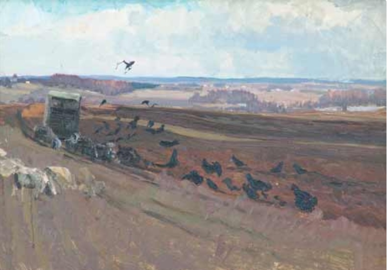 Шурпин. Пахота. 1949. Картон, масло. Те, на кого я сослался, написали: "Федору Шурпину не очень удавались весенние полотна, на его картинах часто весна получалась блеклой, унылой, его подлинной стихией была осень”. А я только из-за блеклости и обратил на него внимание. – Это от пара блеклость! Влажная земля от вдруг пришедшей жары парит. У Шуприна же пар этот как бы соединяет землю с небом. Кричать хочется, вживаясь в эти бледные дали, стремящиеся превратиться в облака, и облака, стремящиеся истаять в голубизне неба. Ну а как я могу пройти мимо такой весны?